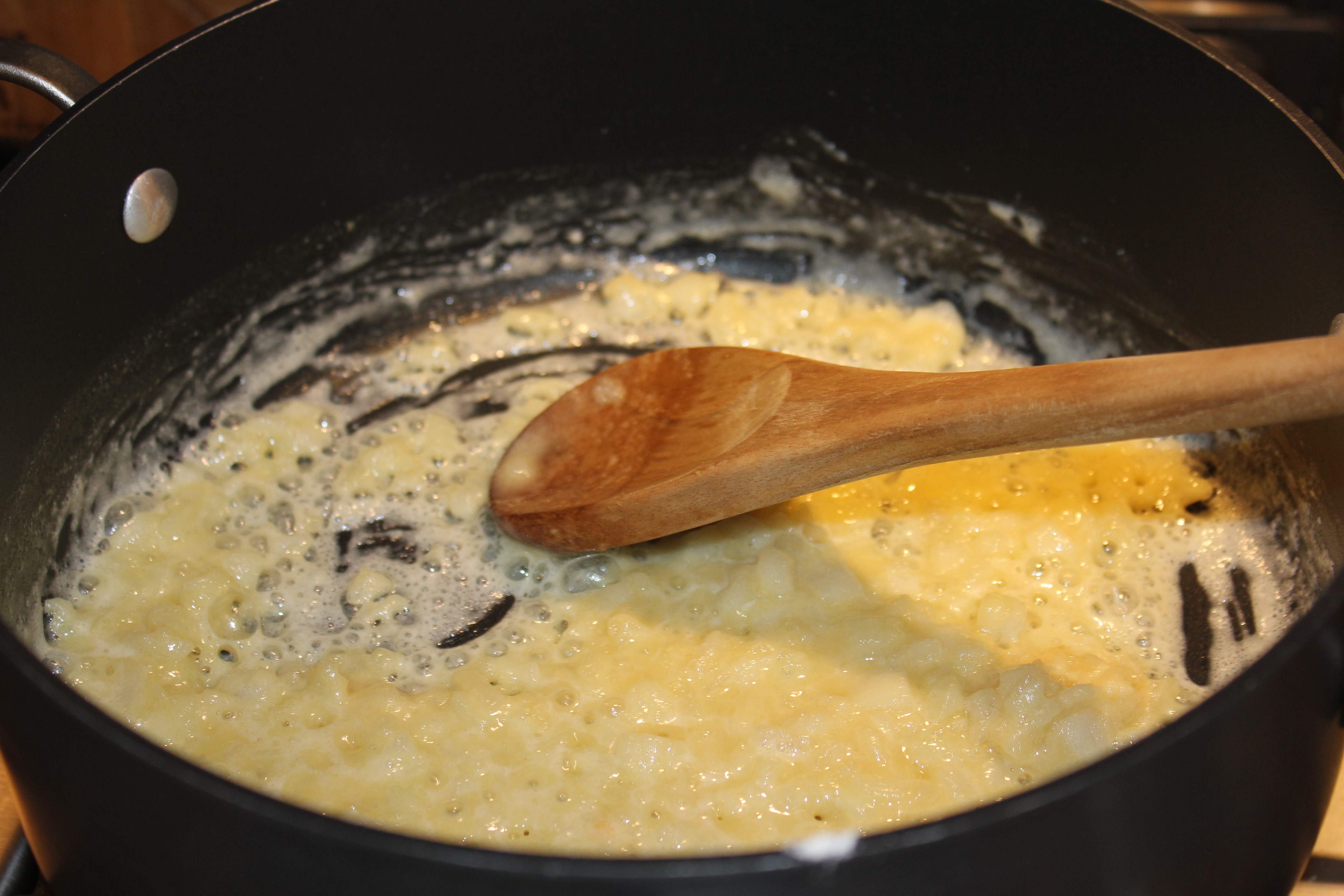 Melt the butter in a large pot over medium heat, and sauté the onion until tender. Stir in the flour and cook for 3 to 4 minutes.