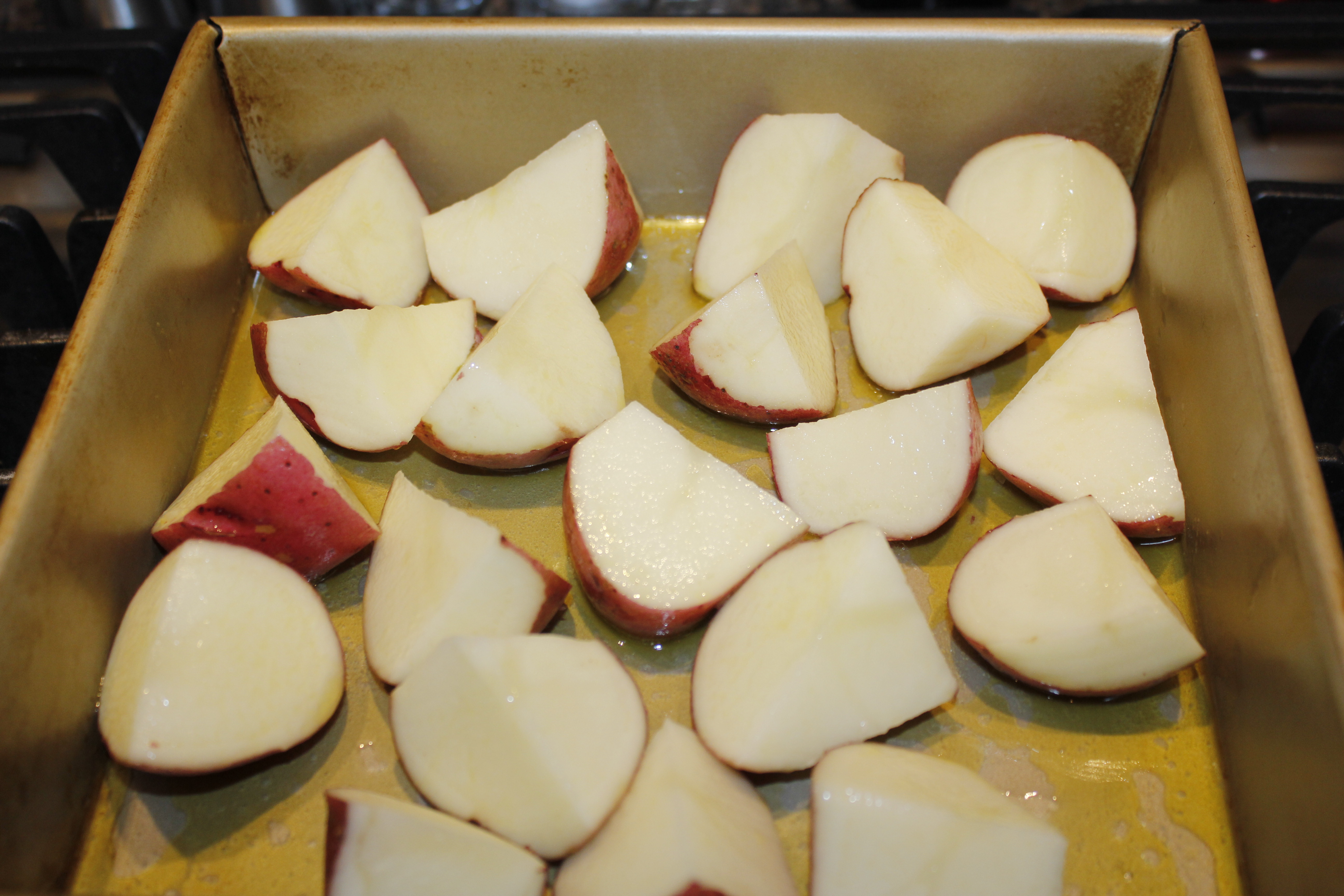 Coat the potatoes on all sides with the melted butter and oil.