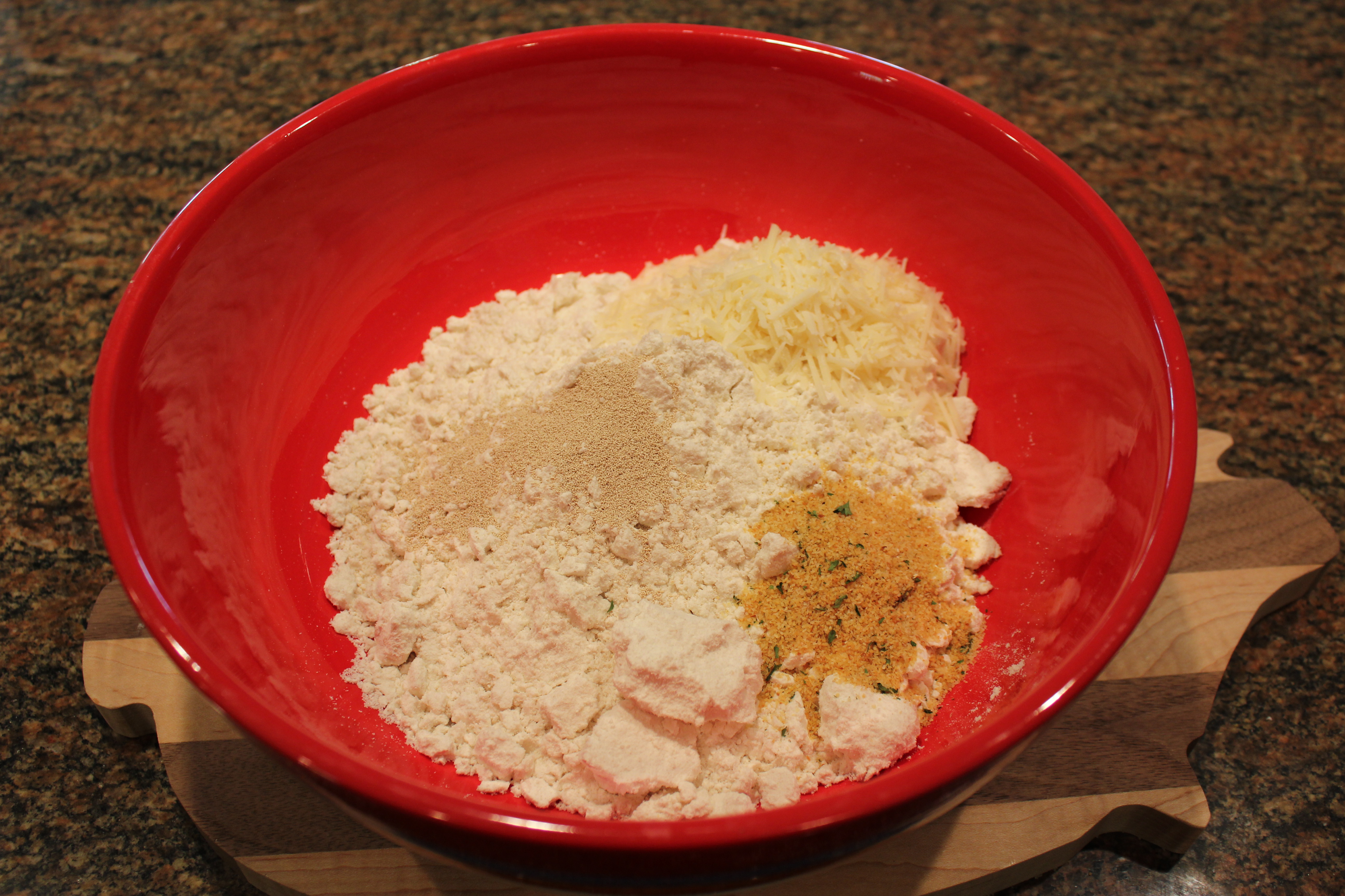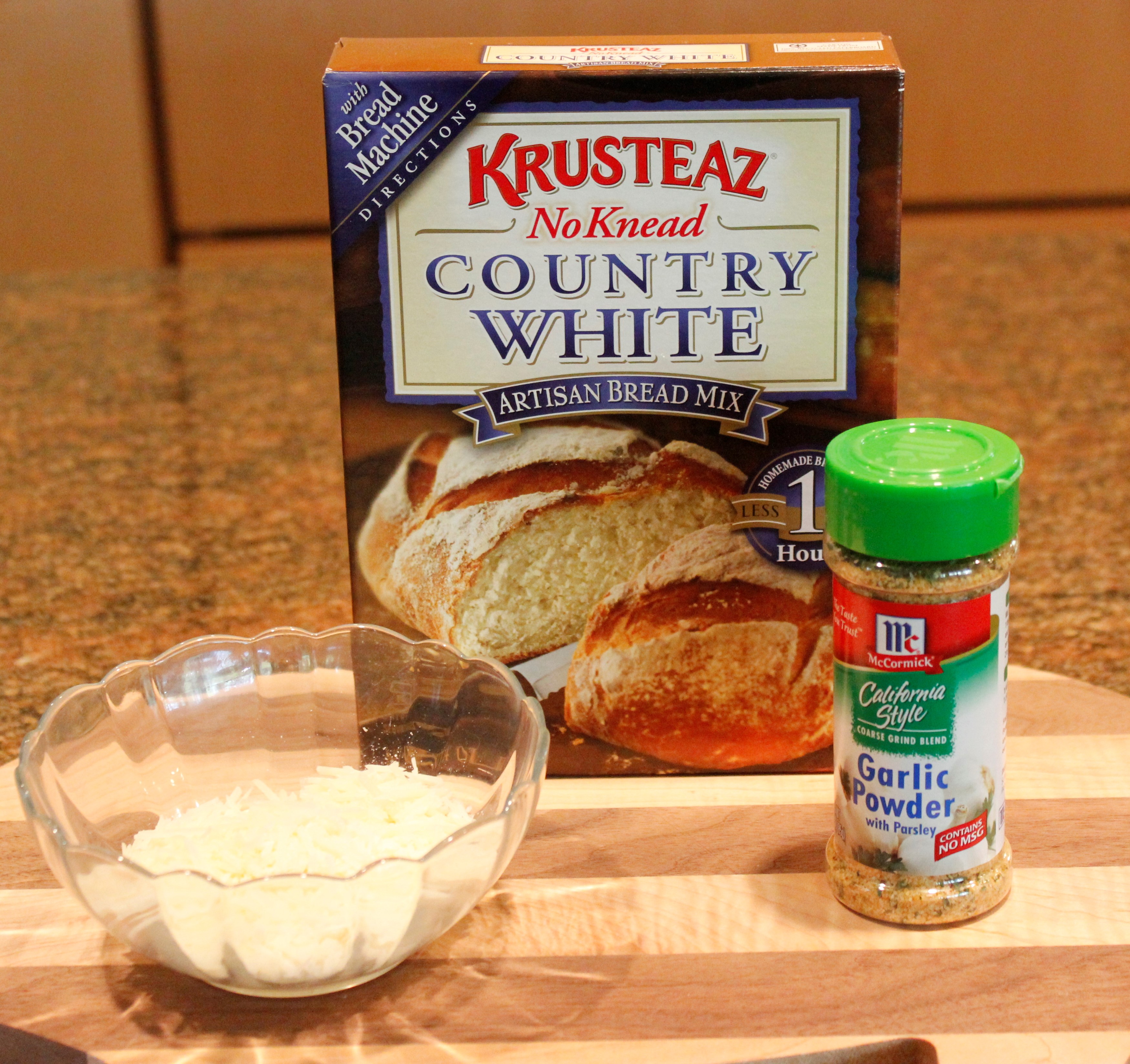 In a large bowl, mix the bread mix, enclosed yeast package, cheese and garlic powder.
