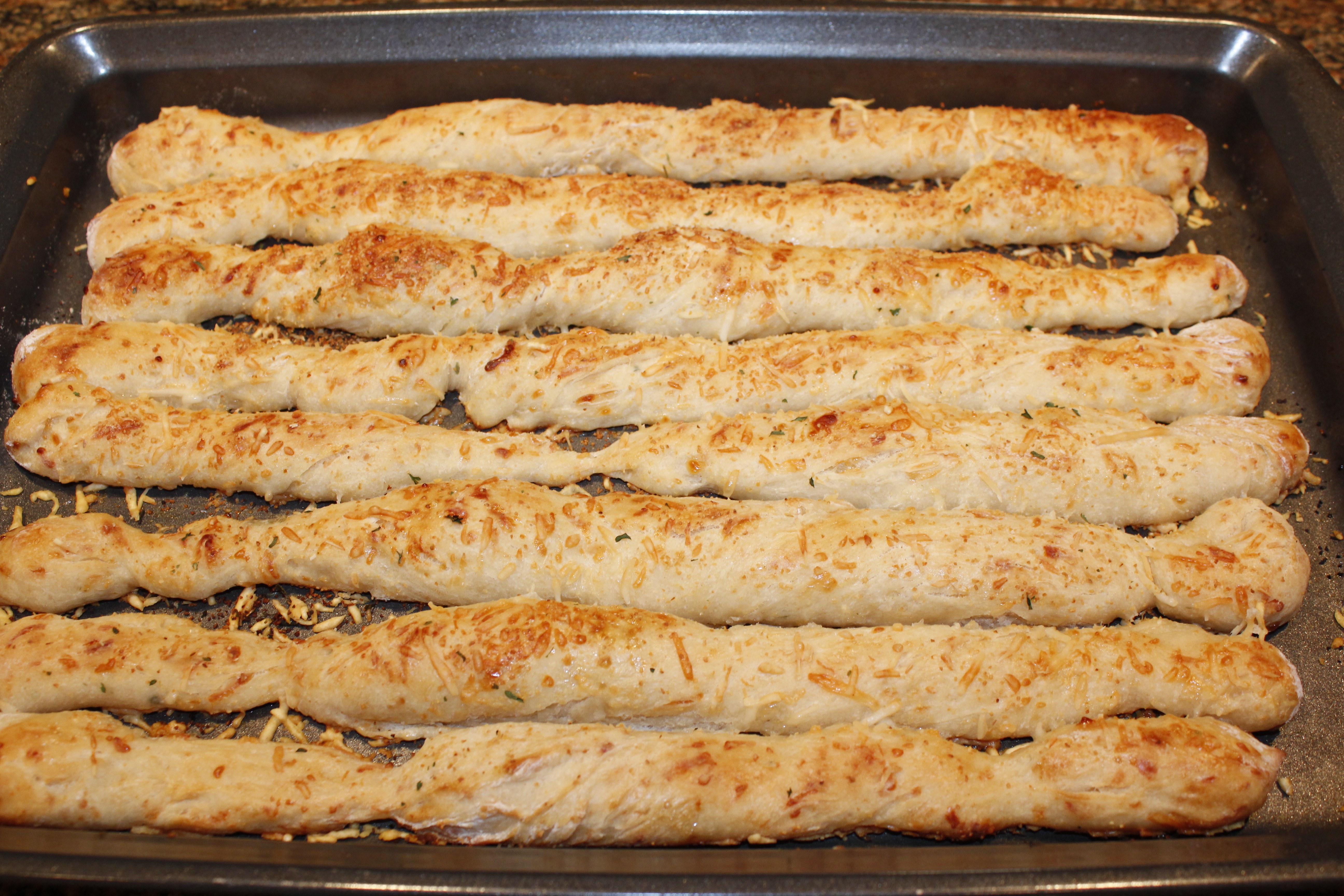 - 1/3 cup grated cheese (I used a blend of parmesan, Romano and asiago), plus more for sprinkling on breadsticks