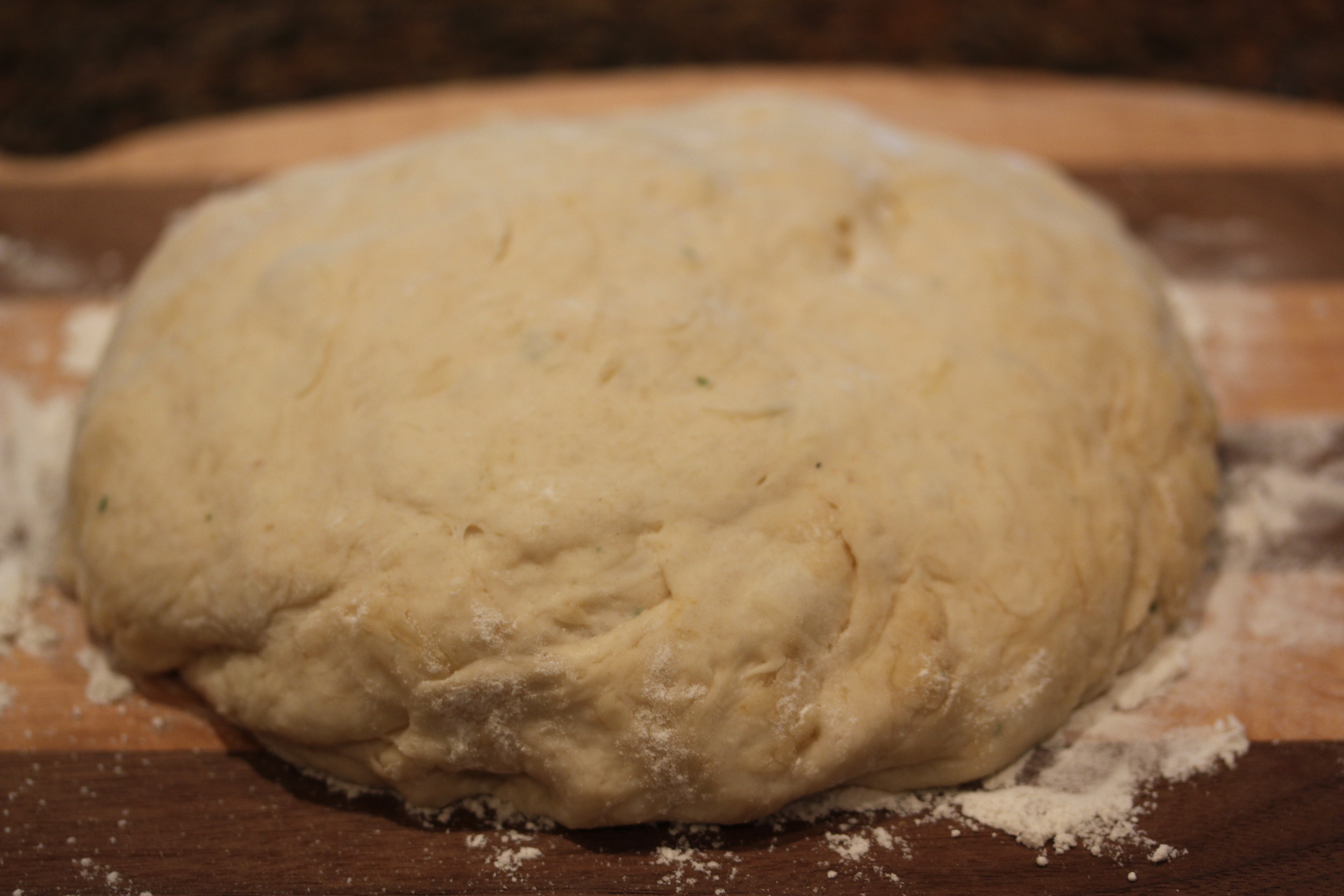 Cover and let rise until the dough has doubled in size, about 2 hours. Sprinkle dough with flour, and transfer to a floured cutting board. Let dough rise for another 40 minutes, uncovered.
