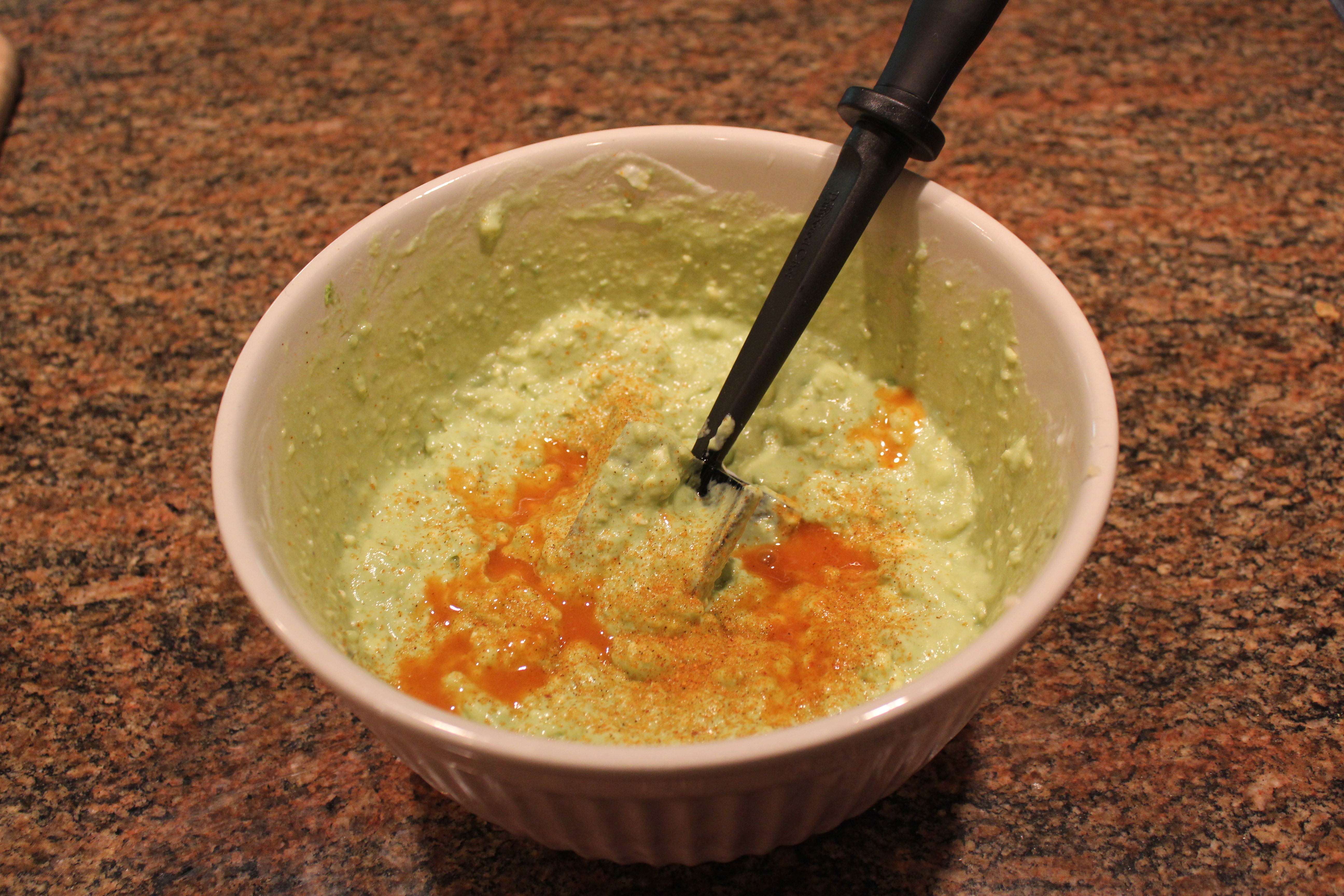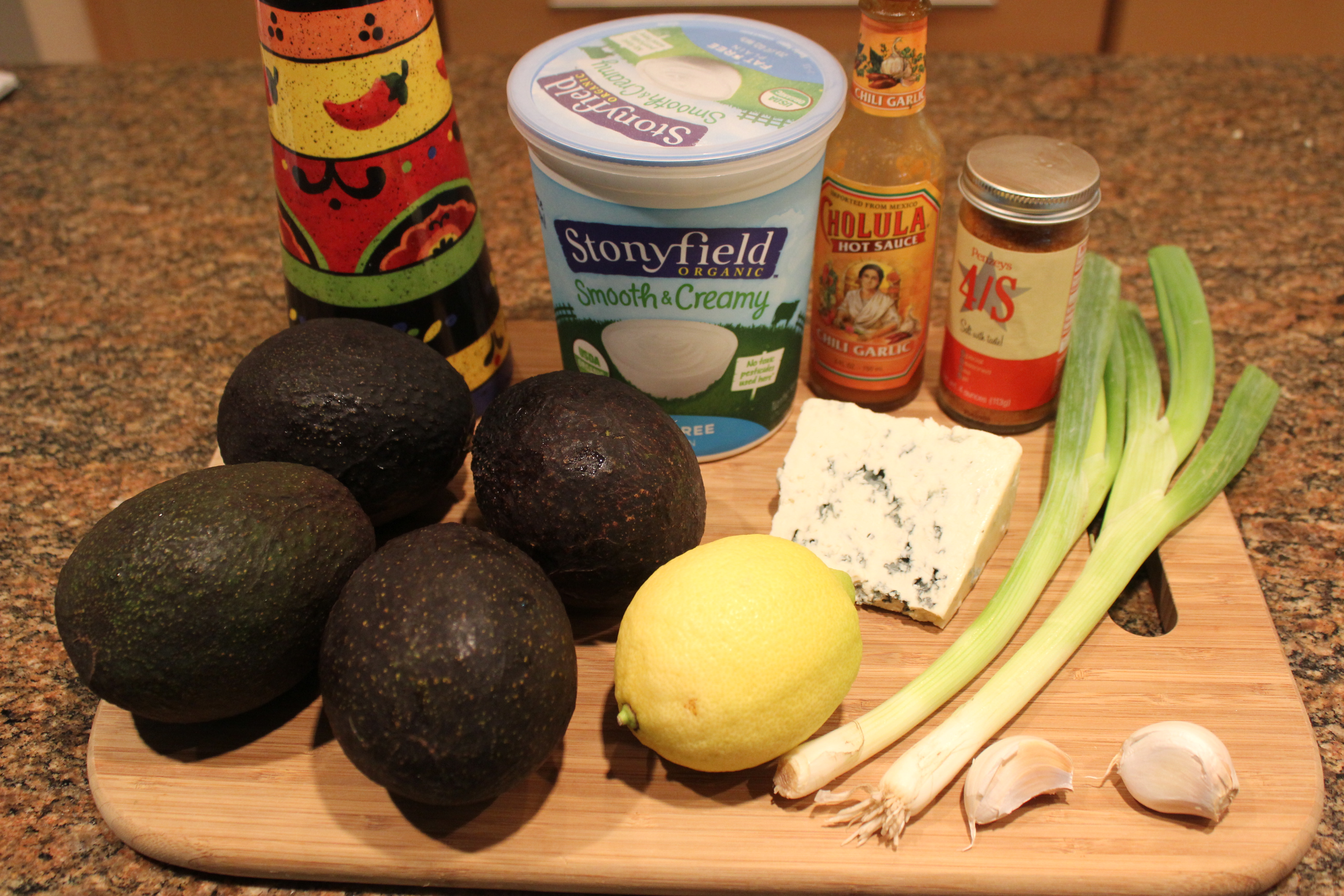 Mix together the avocados, garlic, olive oil, lemon juice, Stonyfield yogurt and bleu cheese. These ingredients should be well blended but still a bit chunky. Fold in some of the scallions.