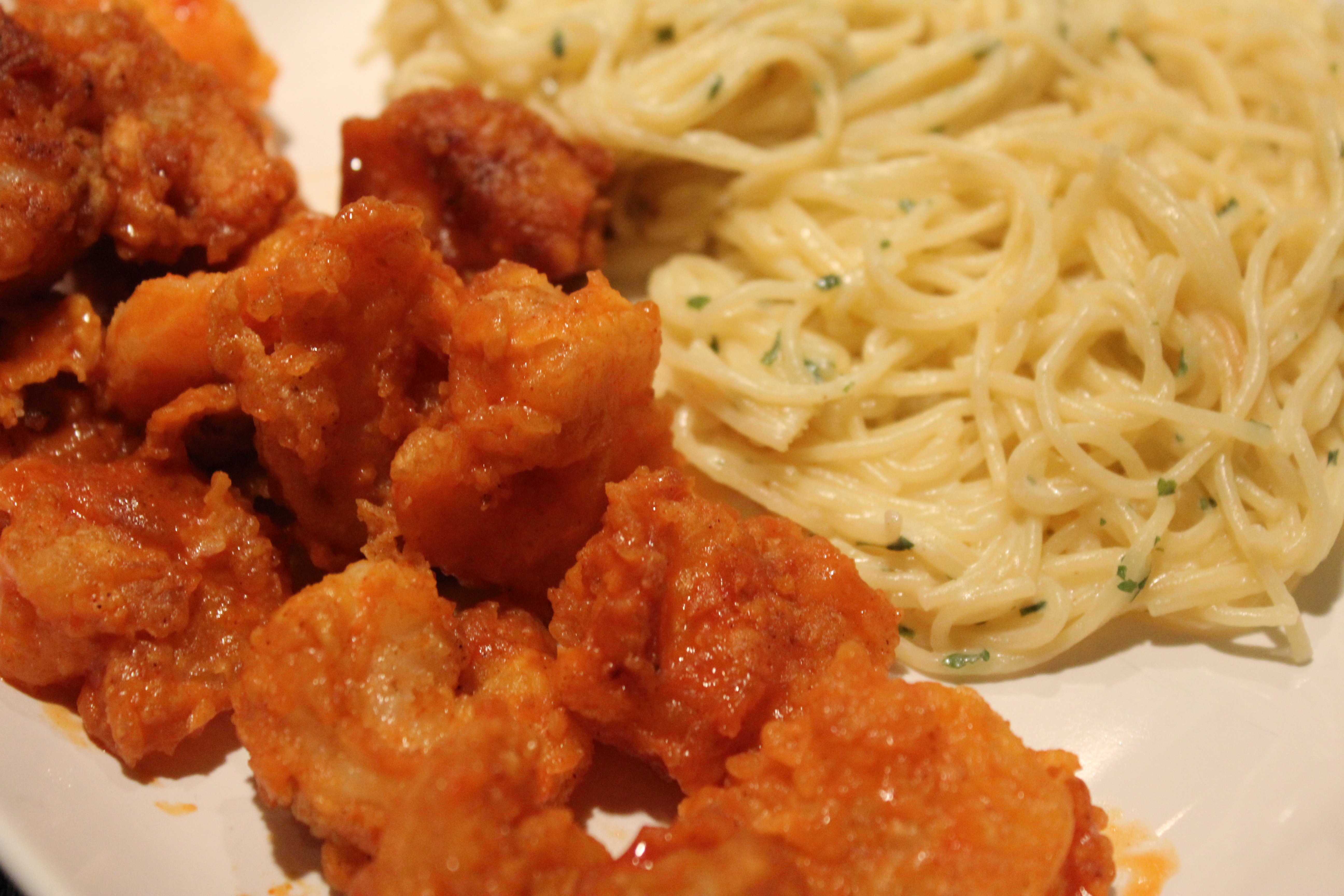 Medium-sized shrimp was on sale the other day at Harris Teeter for $5.99 a pound, so I decided to grab some and prepare them with some buffalo sauce and my homemade bleu cheese dressing. It was a dark and stormy night (yeah, we’ll go with that), so I battered and fried the shrimp – yum!