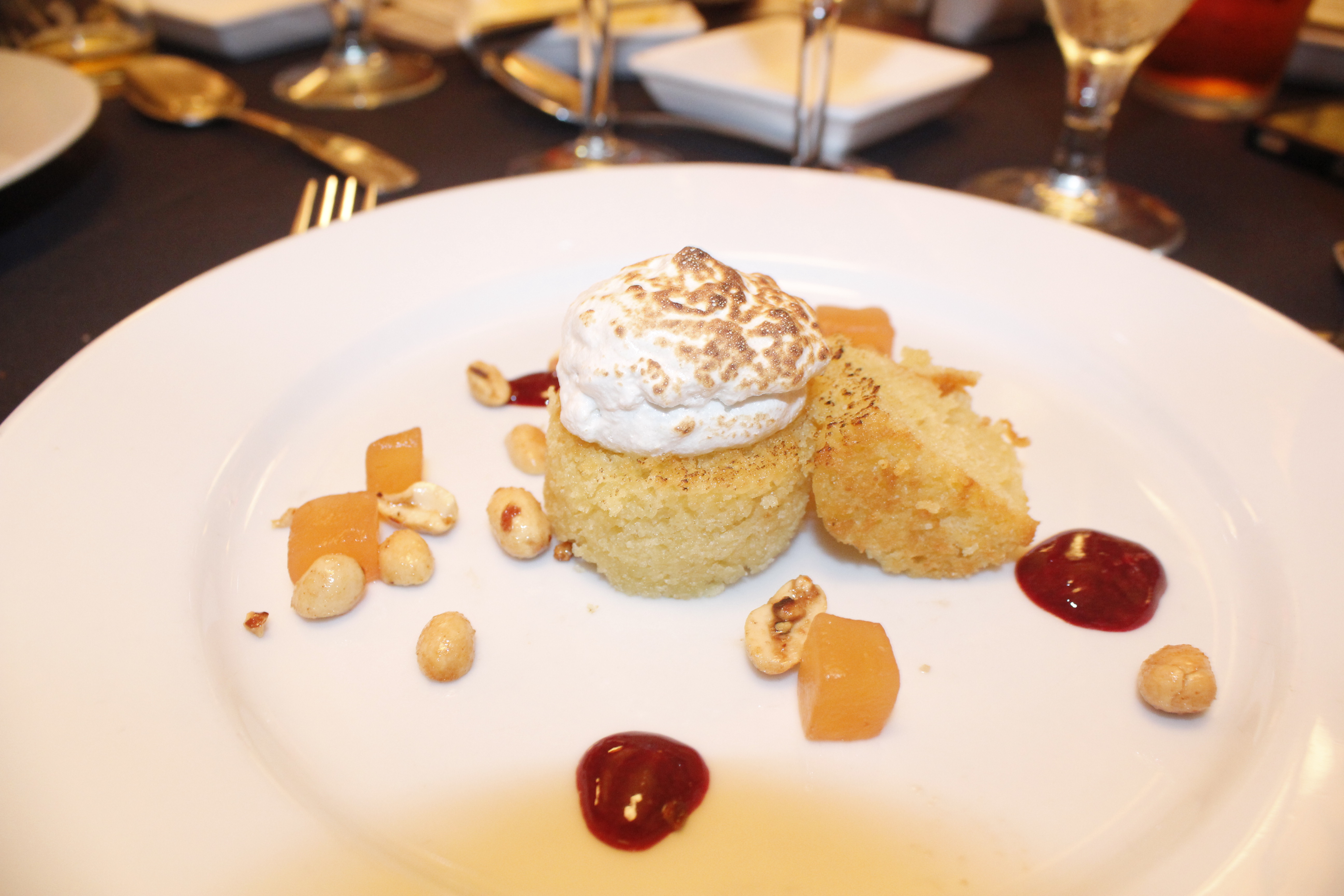 While this course wasn’t rated the highest, it was definitely my favorite. Prawns were presented seared and as a sausage (what a great idea that worked really well). My favorite was how the chef incorporated the venison, which was tender and perfectly cooked. The purees were excellent and I loved the tiny pommes. I hope this dish will appear as an entrée on Jimmy V’s menu — it would be a big hit! The Jones Von Drehle 2012 Rosa Dia complemented the dish quite well and was my favorite wine of the evening. Overall score: 29.49. Chef: Steve Zanini.