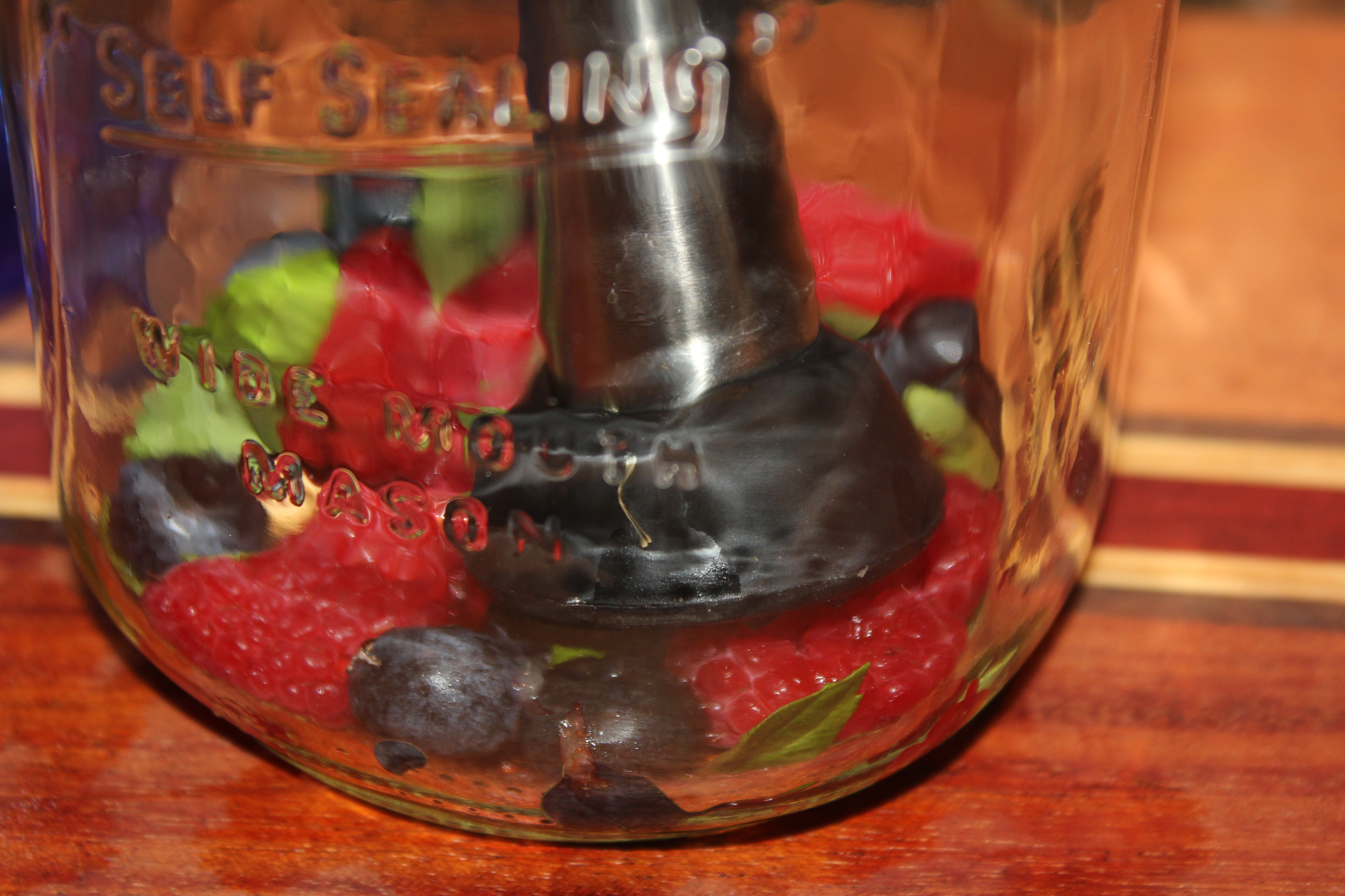 Place the berries and mint in the bottom of your sterilized jar and gently muddle them to release some of their flavors.