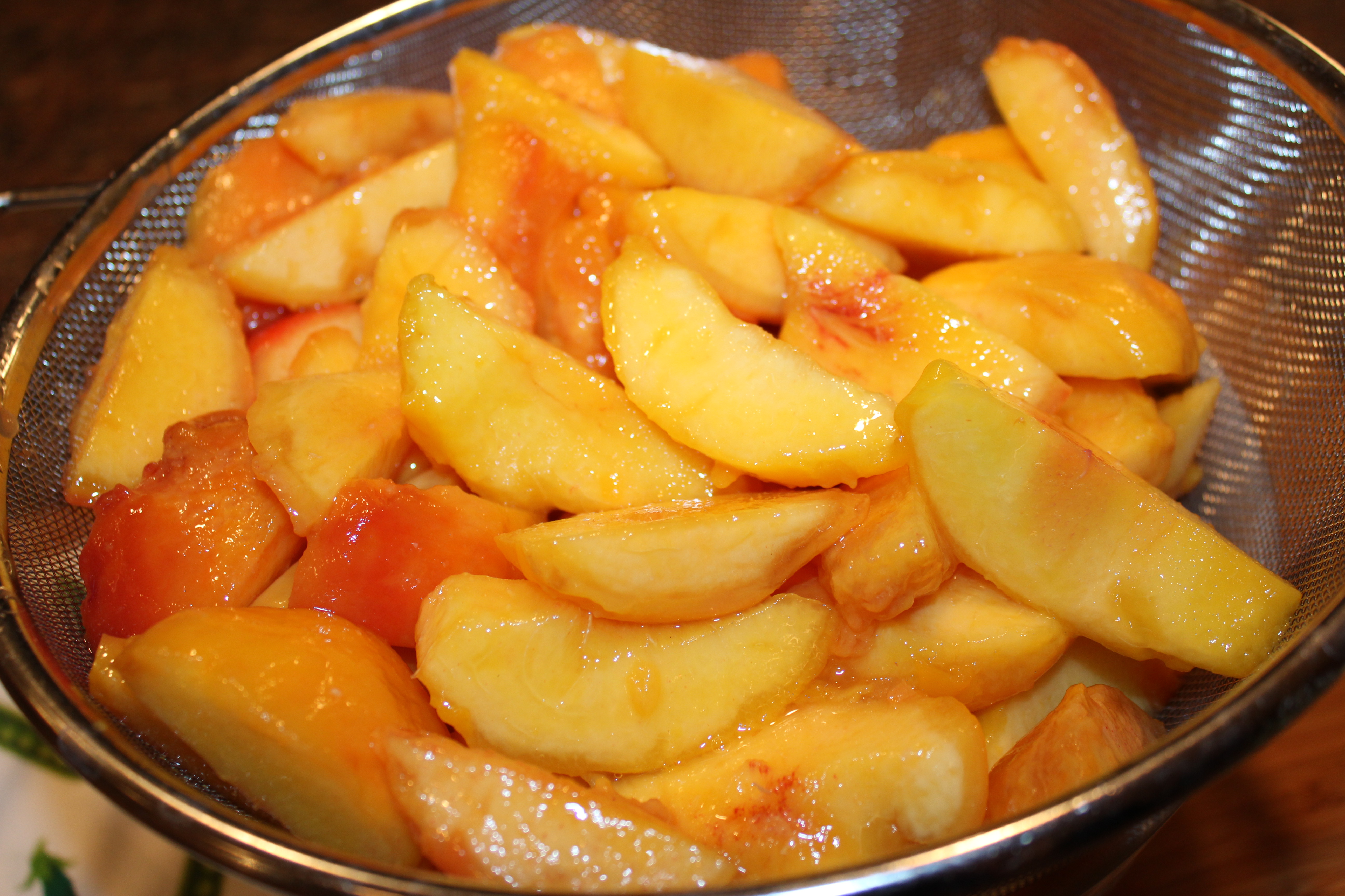 Drain the peaches and add them to the hot syrup. Simmer for 20 minutes or so.