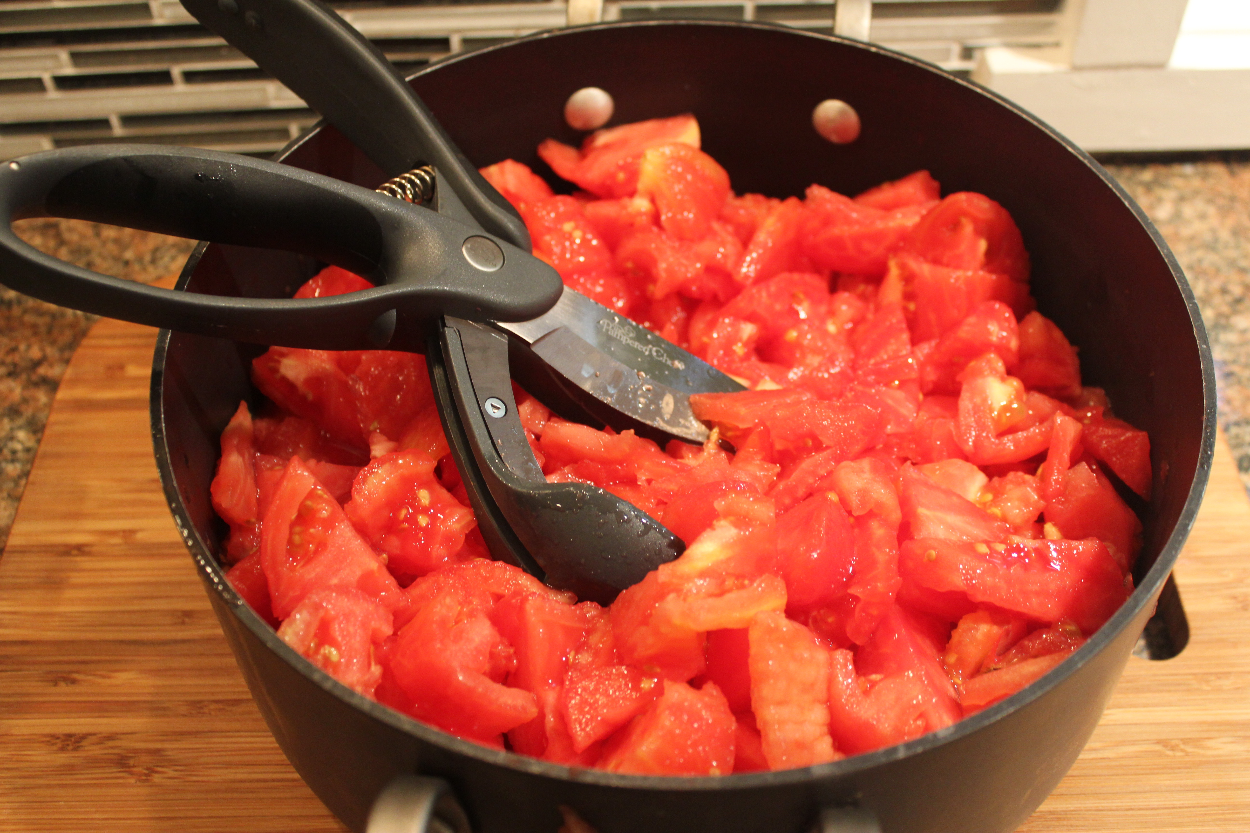 Once the tomatoes have cooled a bit, you can easily remove the peels. Cut them into quarters, remove any white pieces, and place them in a large bowl or pot. Coarsely chop them (I love my Pampered Chef salad chopper for this step.)