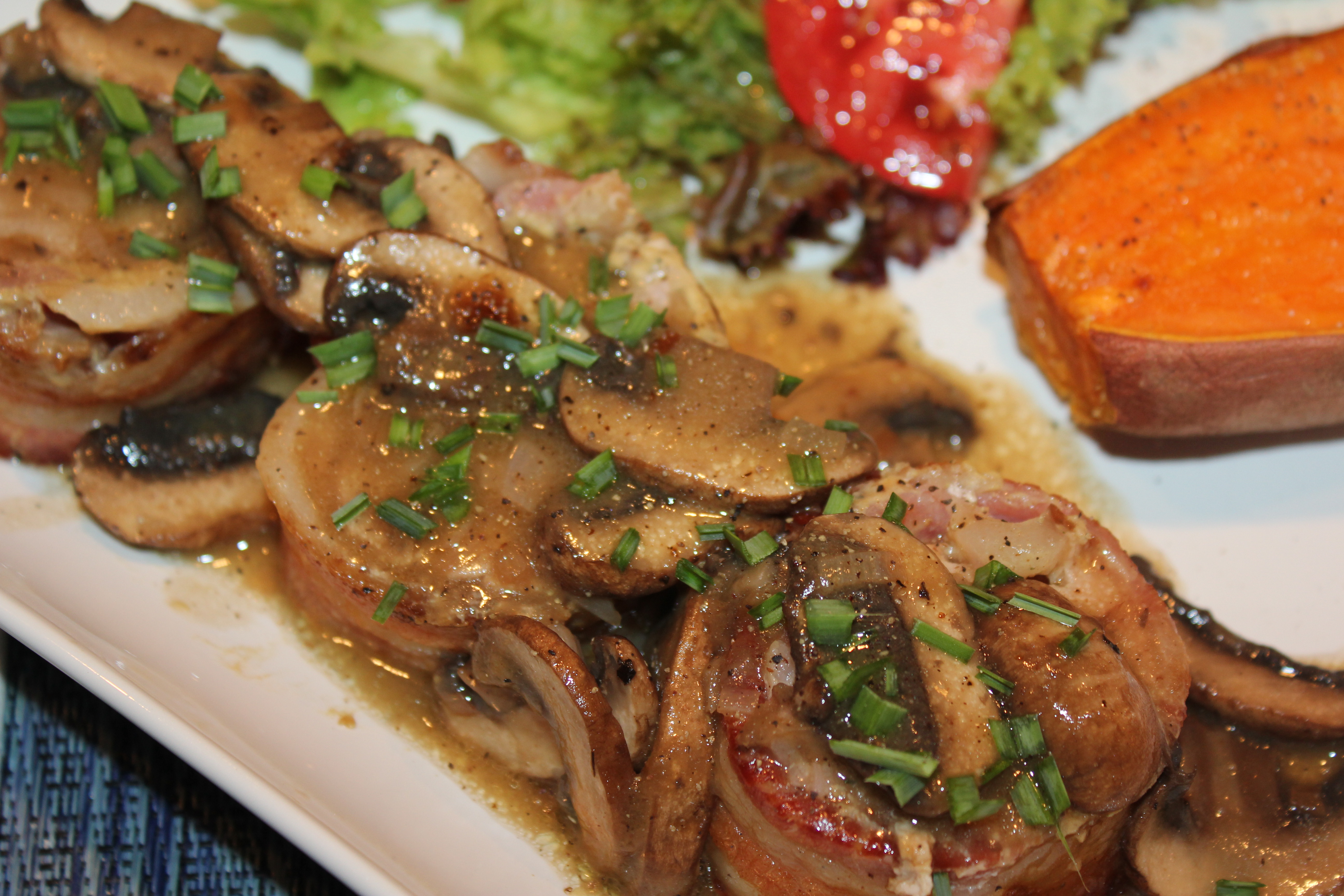 Kel's bacon-wrapped pork tenderloin with vermouth mushroom sauce