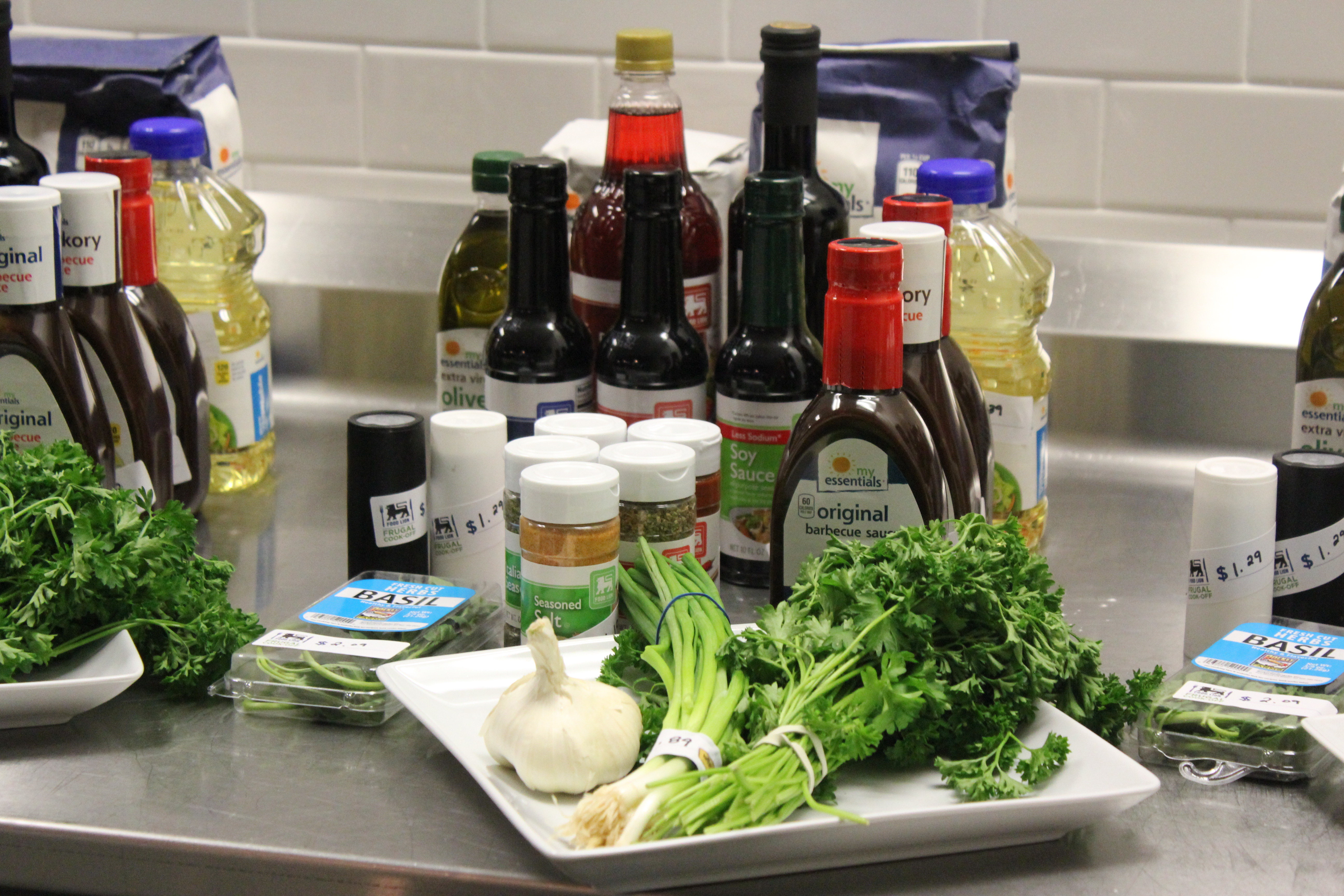Once we decided on the recipes, we started thinking about our side dishes, all while staying within the $15.00 budget and the 45-minute timeframe. We were told that we’d be provided with some kitchen staples at no cost, such as seasonings, oil, vinegar, salt and pepper, flour, etc. And our secret ingredient was free, too.