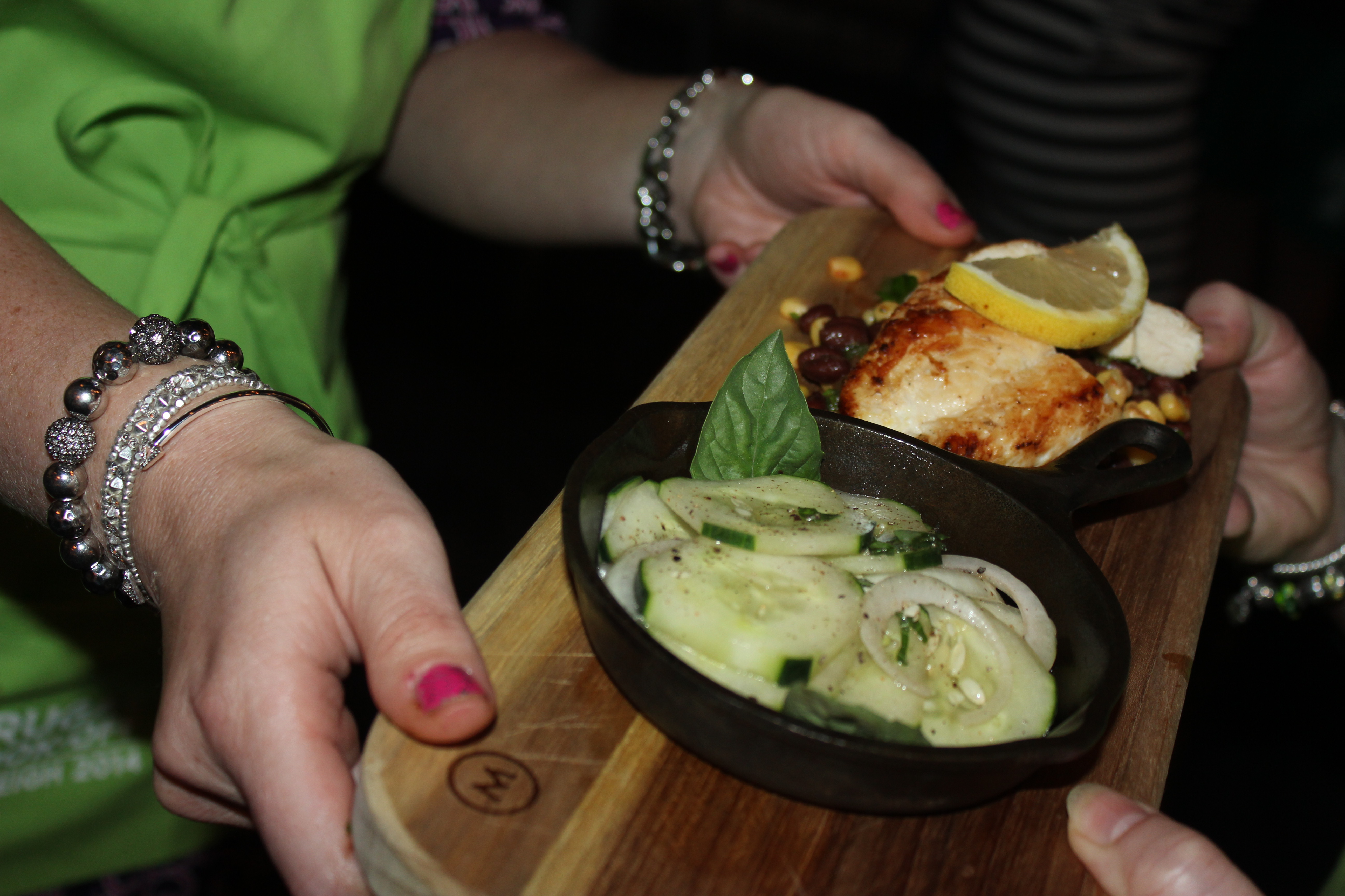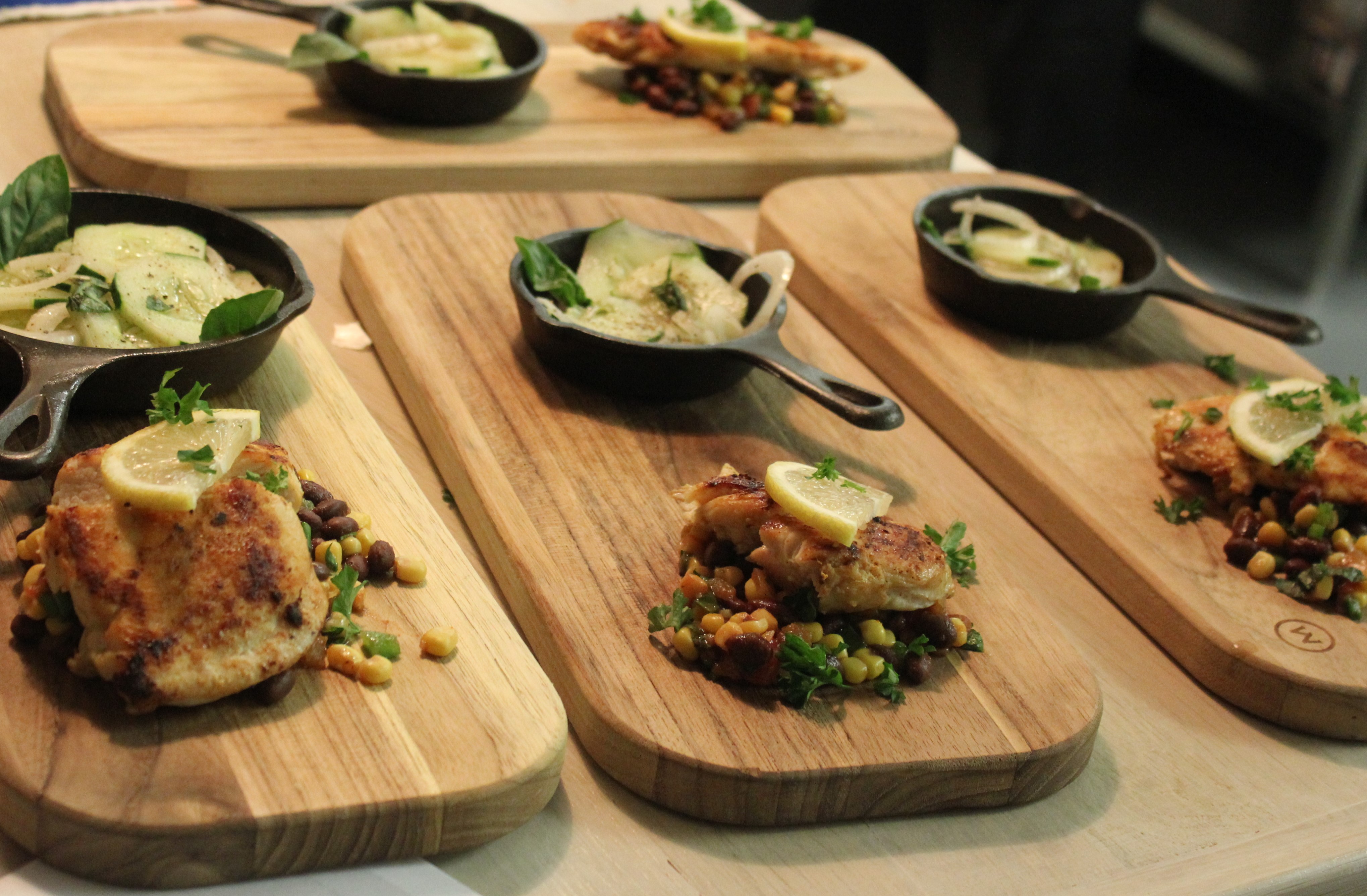 The 45-minute cooking time flew by, with the Food Lion folks and PR consultants taking pictures and asking questions about our dishes, which we were able to plate before time ran out. Speaking of plating, Rachel consulted with Driftwood’s chef and decided to use a flat wooden slab with a mini cast iron pan – how rustic! So we named the meal “Rustic Lemon Chicken with Black Bean and Corn Fiesta Salad and a Cucumber Onion Medley.”