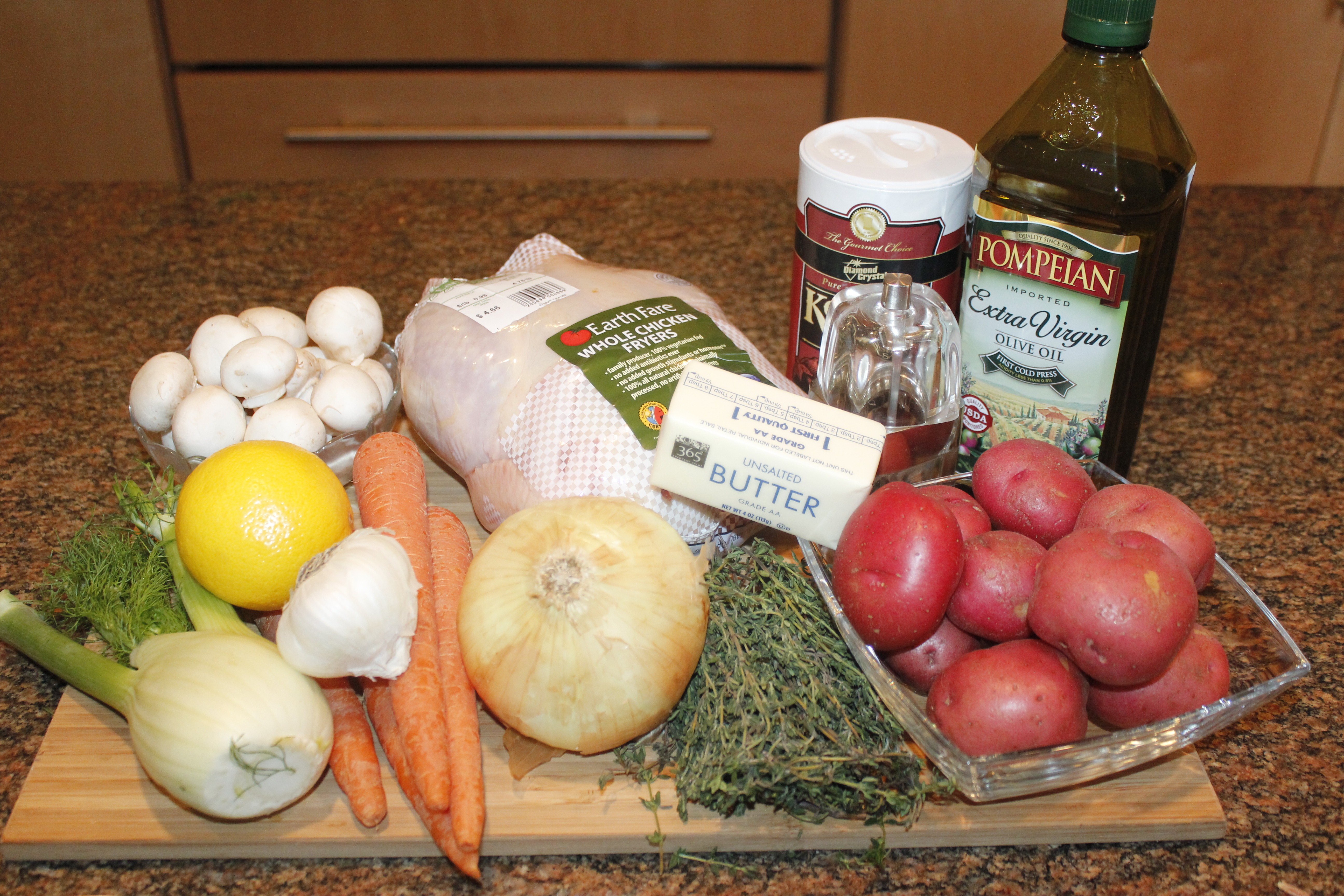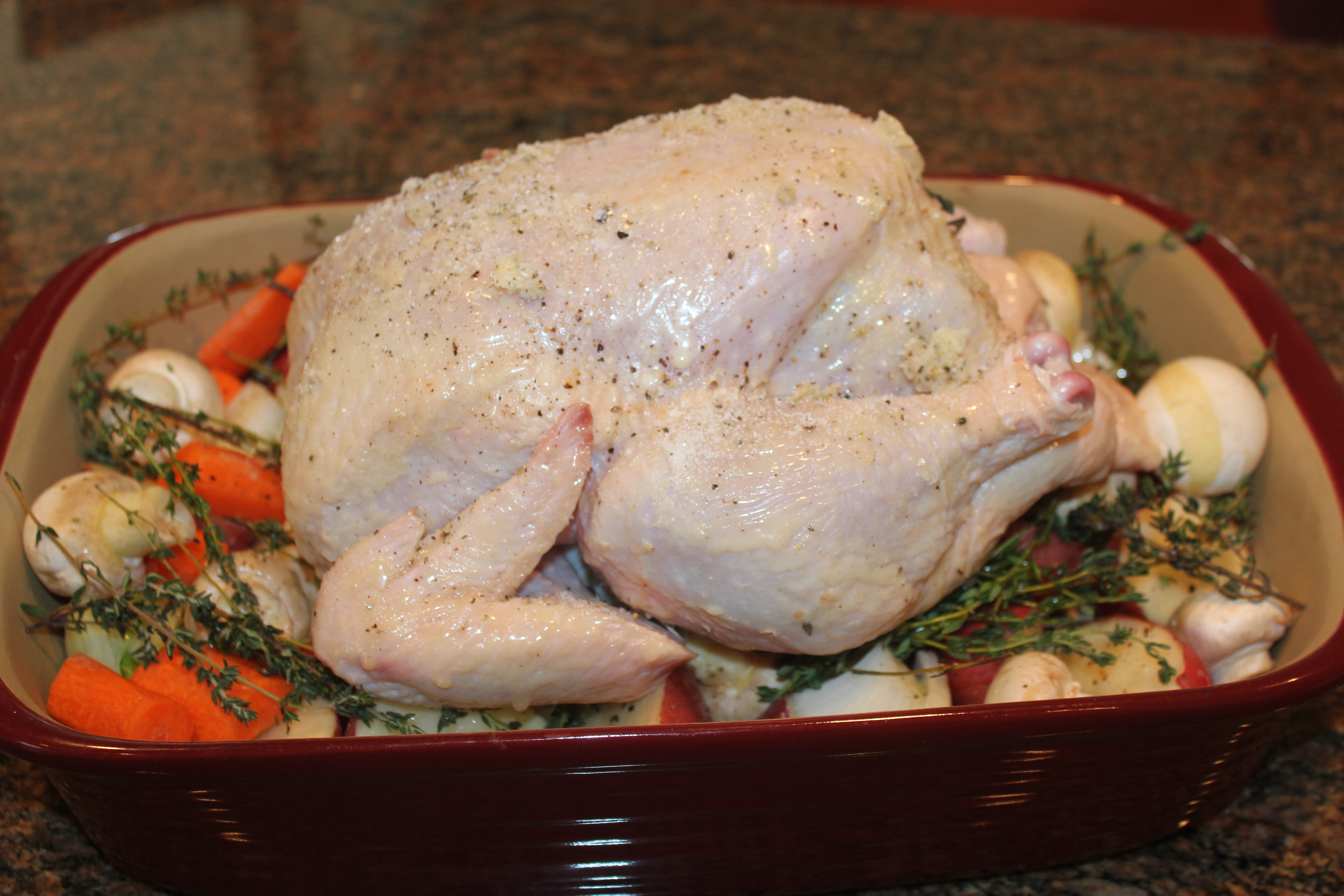 I have a variety of great roast chicken recipes, but wanted something to showcase roasted veggies as well. Enter Ina’s recipe for Perfect Roast Chicken (http://www.foodnetwork.com/recipes/ina-garten/perfect-roast-chicken-recipe.html), which looked pretty perfect to me. So what did I change? Not much, except for including some mushrooms and small red potatoes (both on sale, of course), to add some complexity and depth to this dish. You will want a large, deep casserole dish for this (13×9) to hold all of the ingredients.