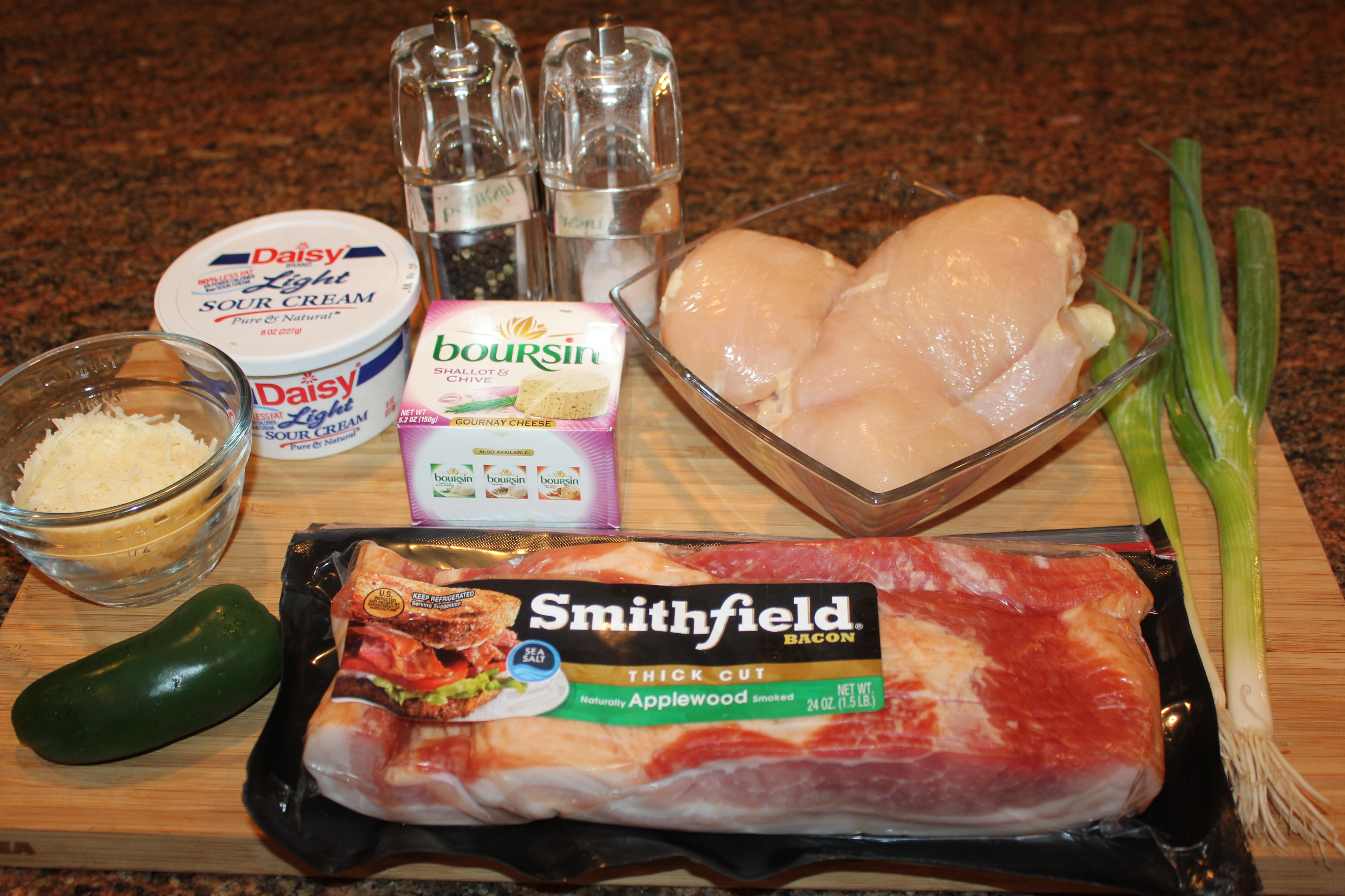 Brad loves Boursin® cheese, but I rarely buy it unless it’s on sale, since it is a bit pricey. Well, he was in luck the other day because Harris Teeter had it BOGO free. I decided to use one of the packages to stuff a couple of chicken breasts I needed to cook, and then thought that I should really wrap them in bacon. Sometimes good thoughts like that just pop in my head. I also thought I needed to add some jalapenos for heat, and voila! a tasty entrée was in the making.
