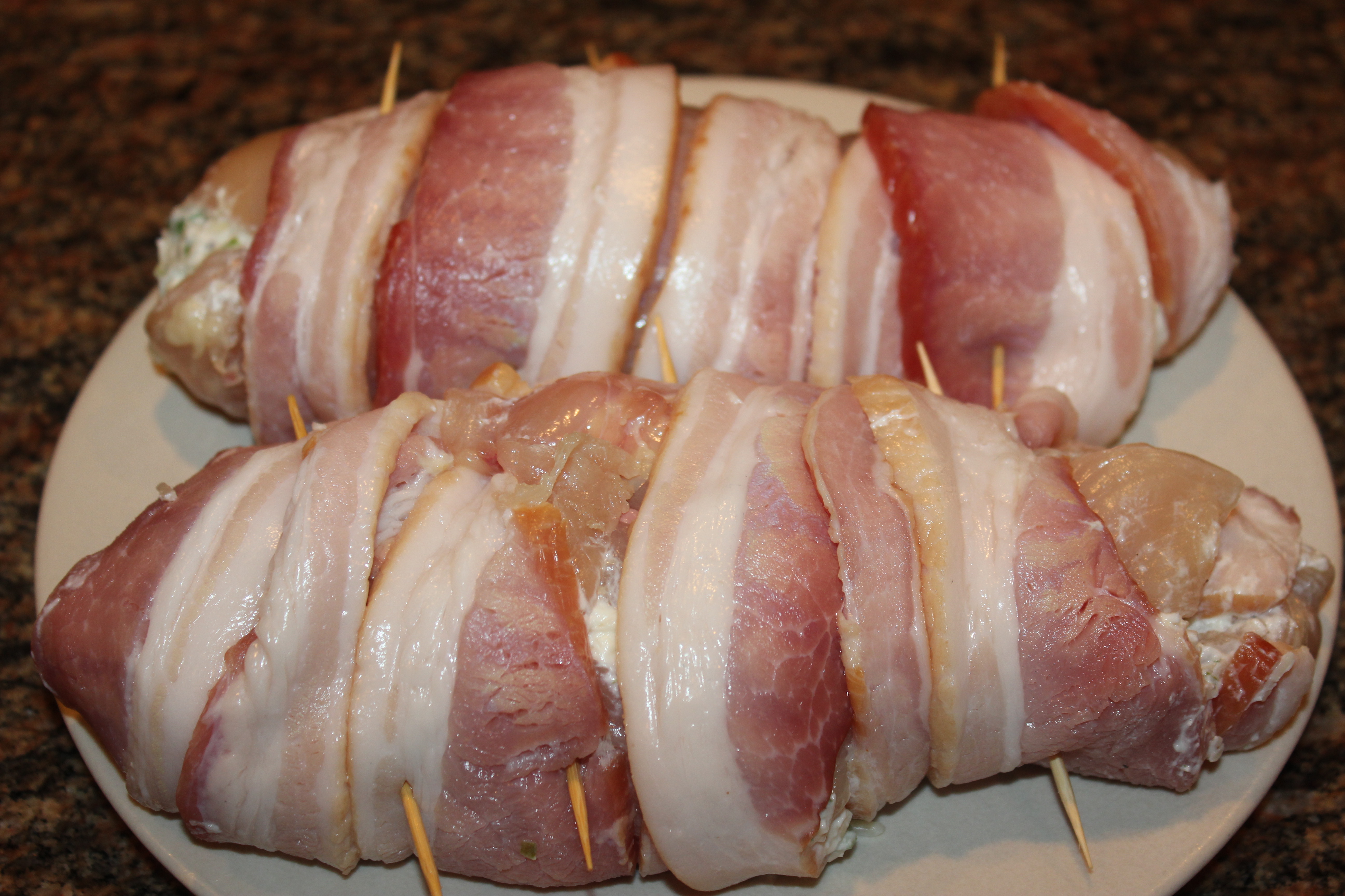Completely wrap each stuffed breast with the bacon slices – it took 3 slices per breast this time out. Secure with long, plain wooden toothpicks in several places (obviously, I could have done a much better job at this, lol.) Refrigerate for at least half an hour before grilling.