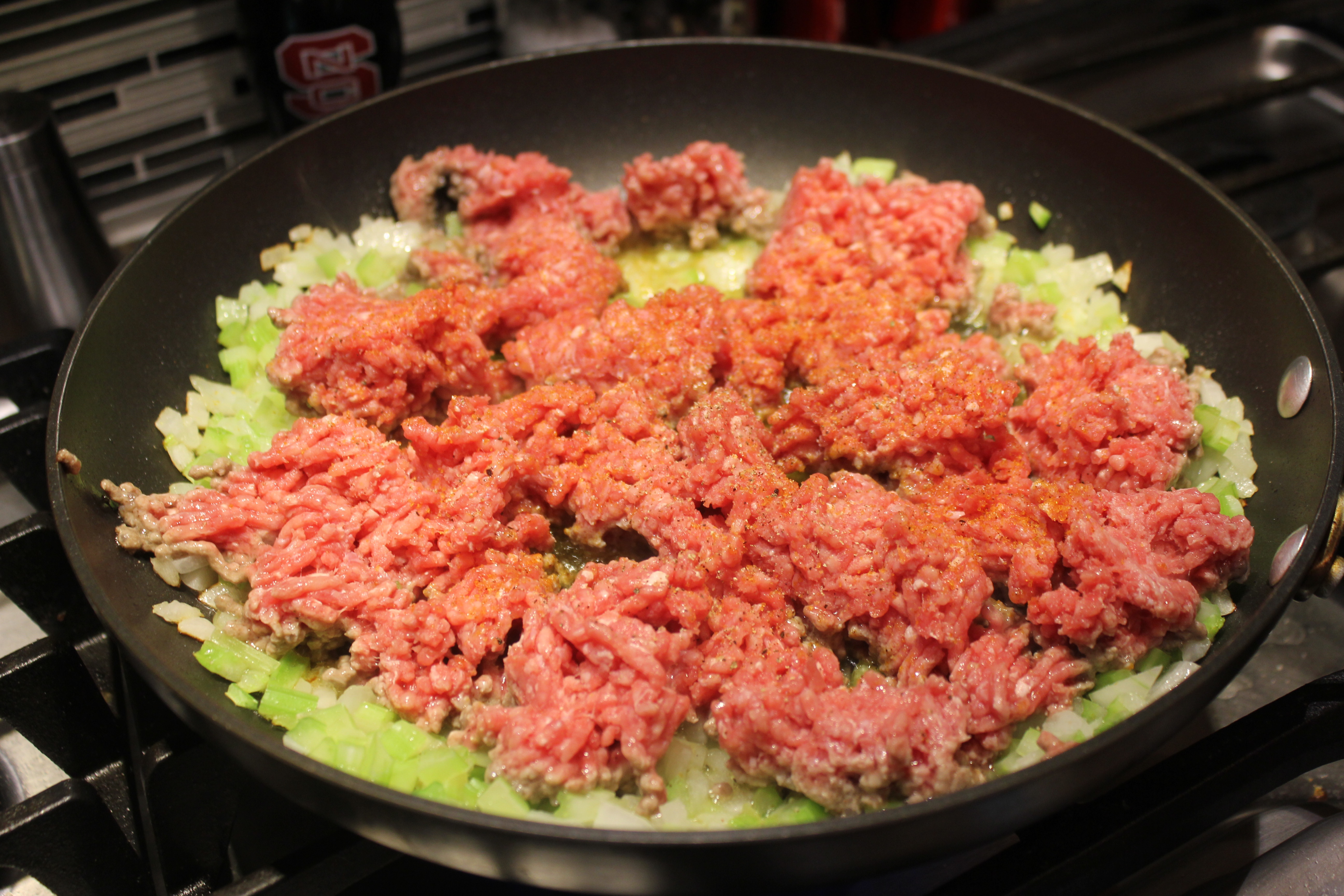 In a large skillet, heat the olive oil to medium. Add the onion, celery and garlic and sauté for a few minutes. Add the ground beef, season it with salt and pepper to taste, and break it apart as it browns.
