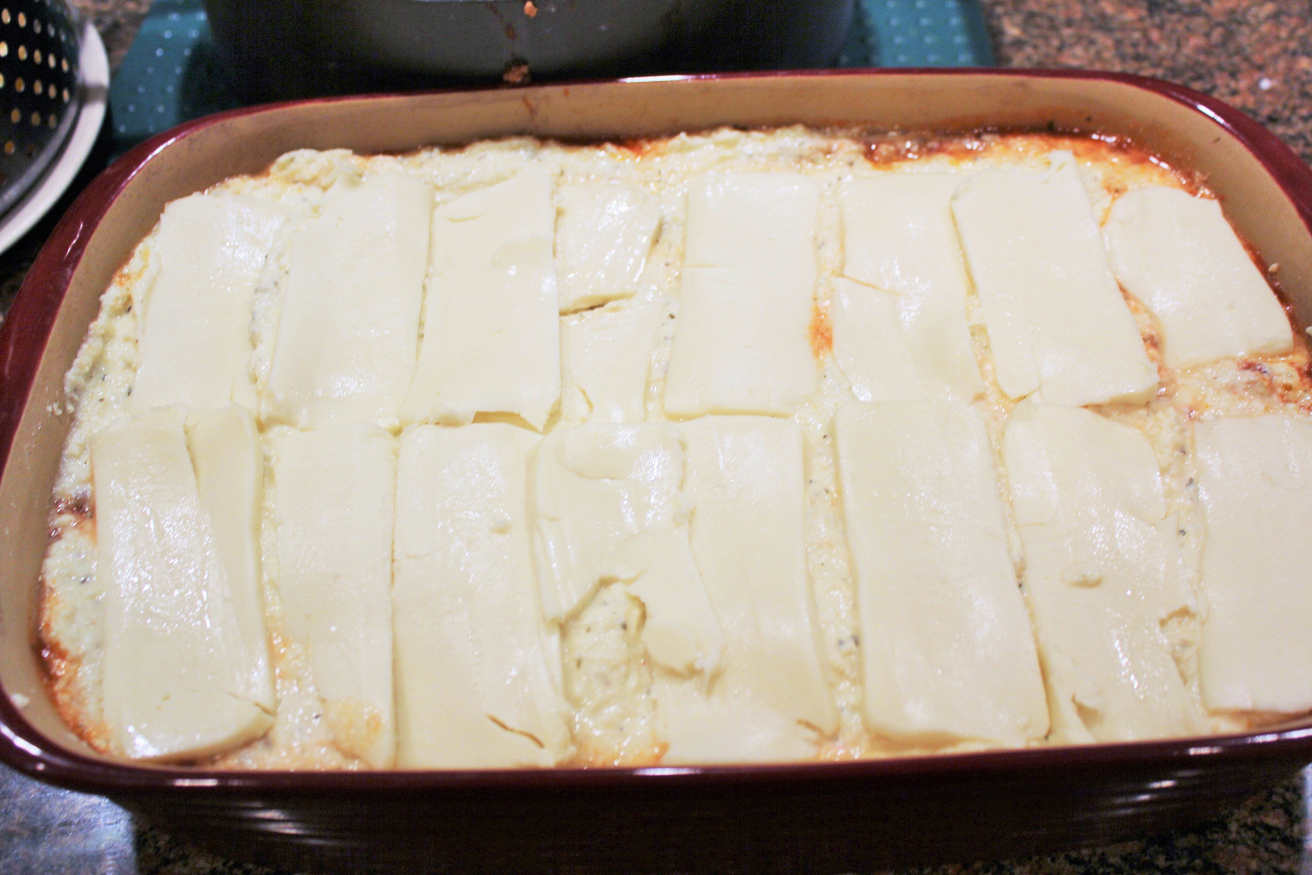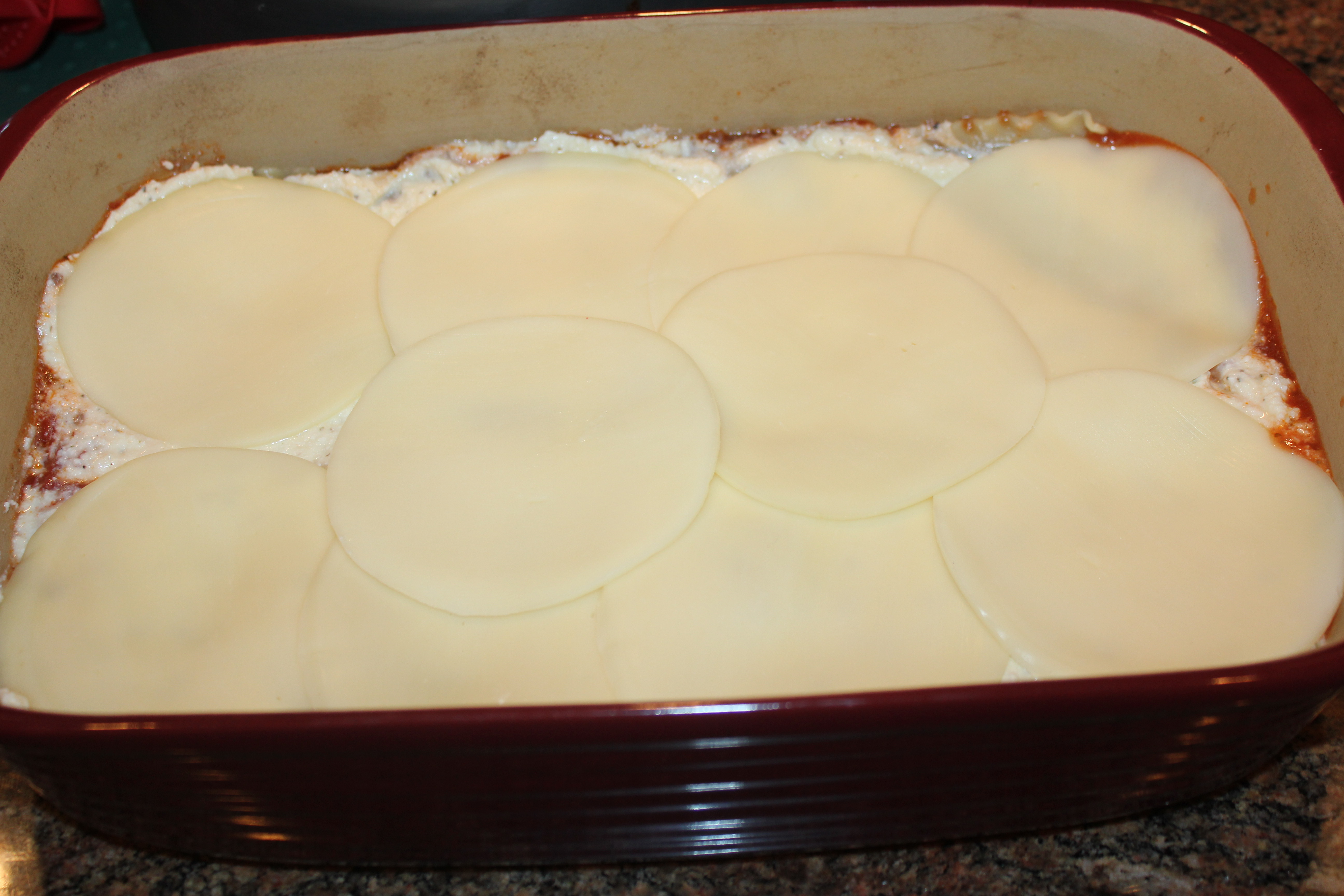 Layer 2: Add enough sauce to cover the provolone, add 4 noodles, the rest of ricotta mixture, and top with the mozzarella slices.