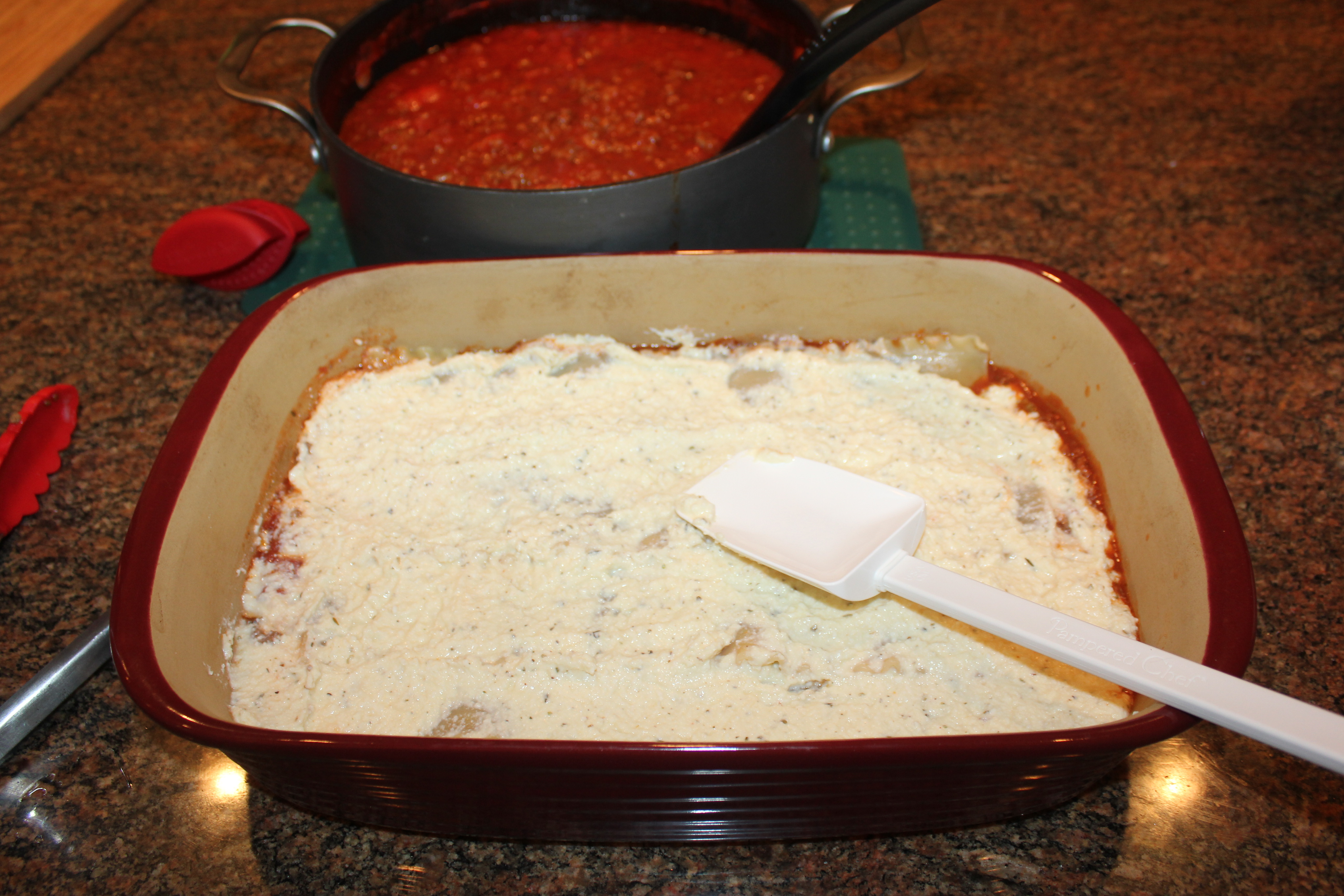 Layer 1: Cover the bottom of your dish with a thin layer of the sauce. Place 4 noodles on top of the sauce.