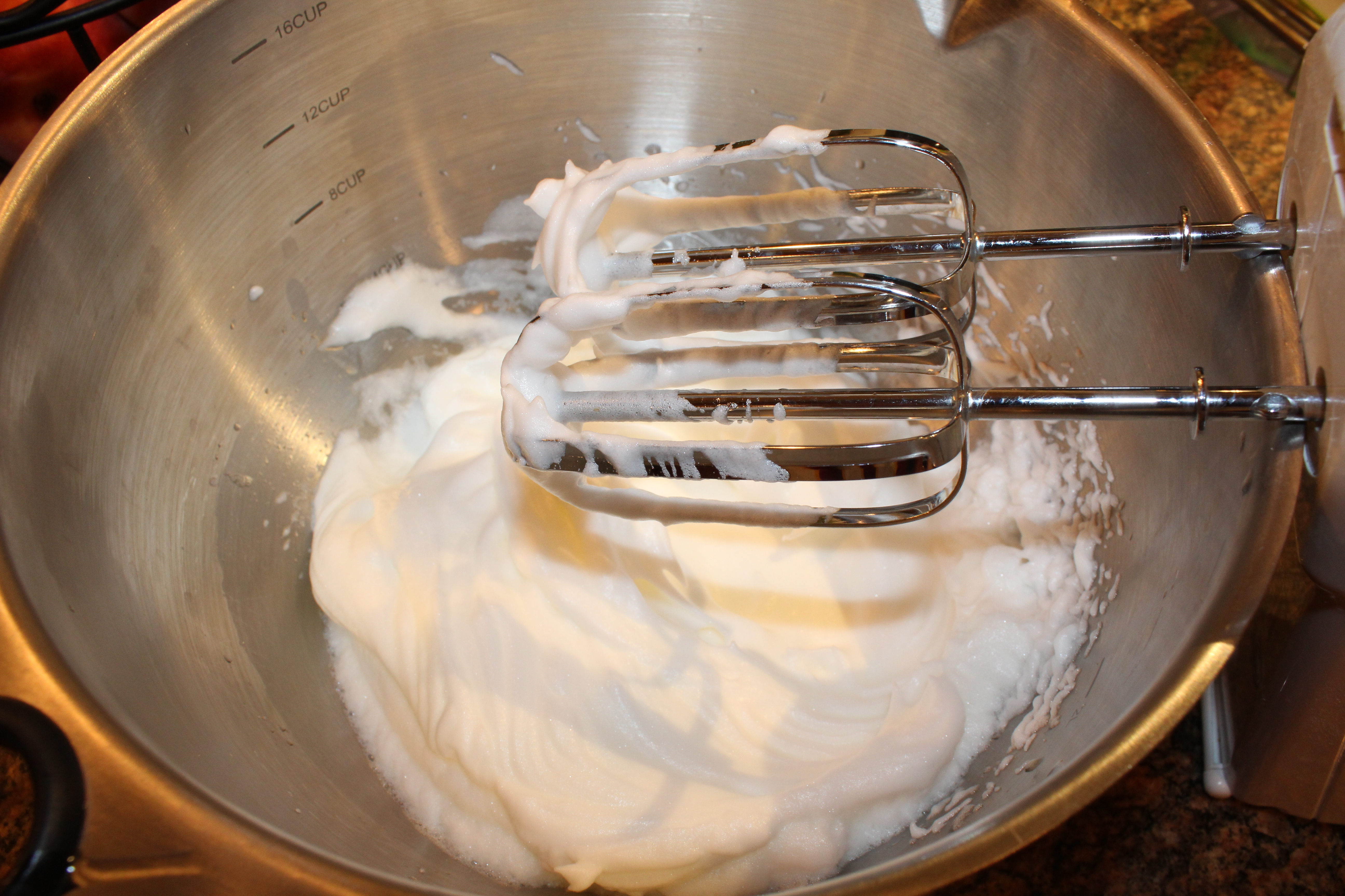 Place the egg whites in a bowl. Using an electric mixer, beat on high speed until peaks start to form. Add the egg yolk and beat for a few more minutes.
