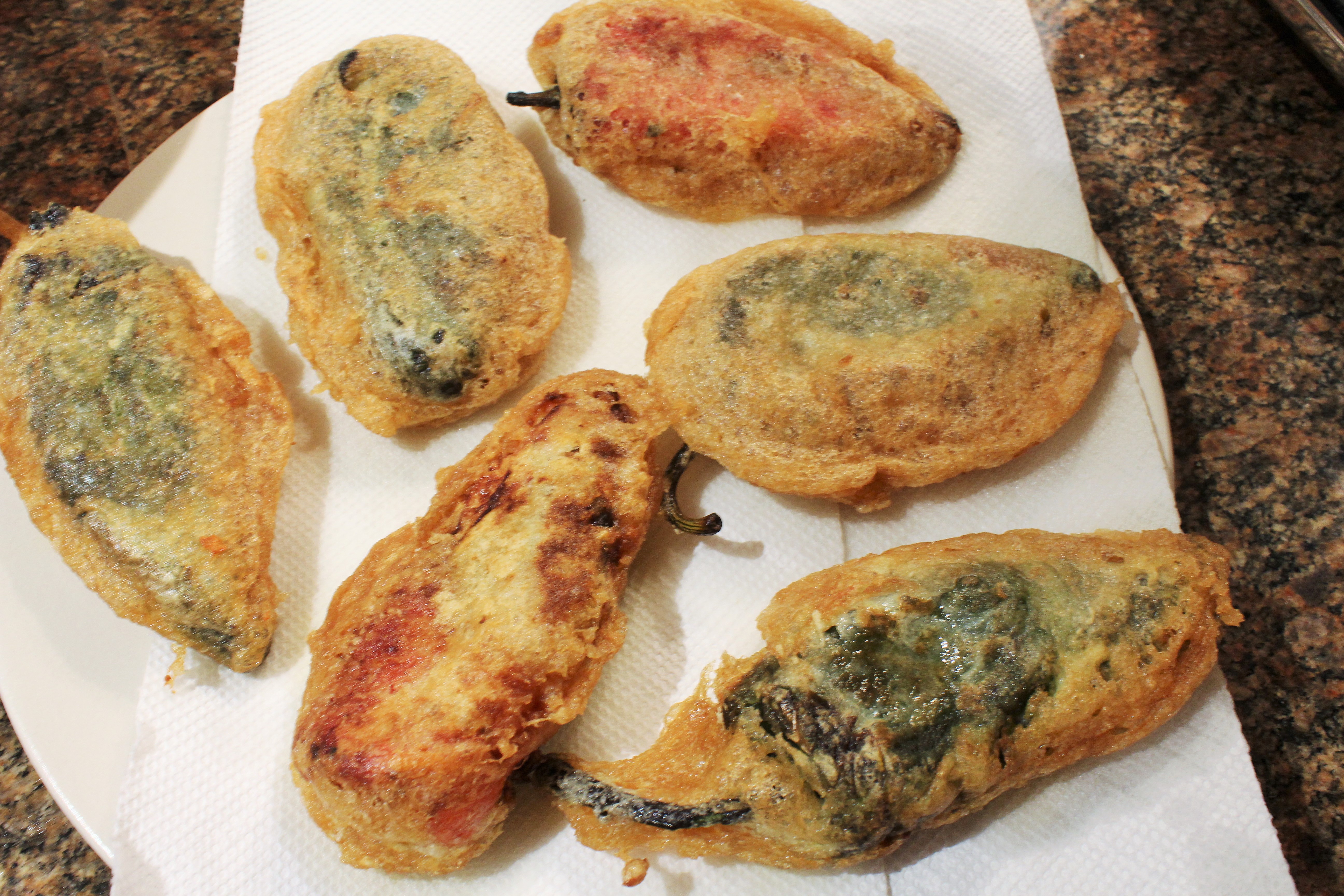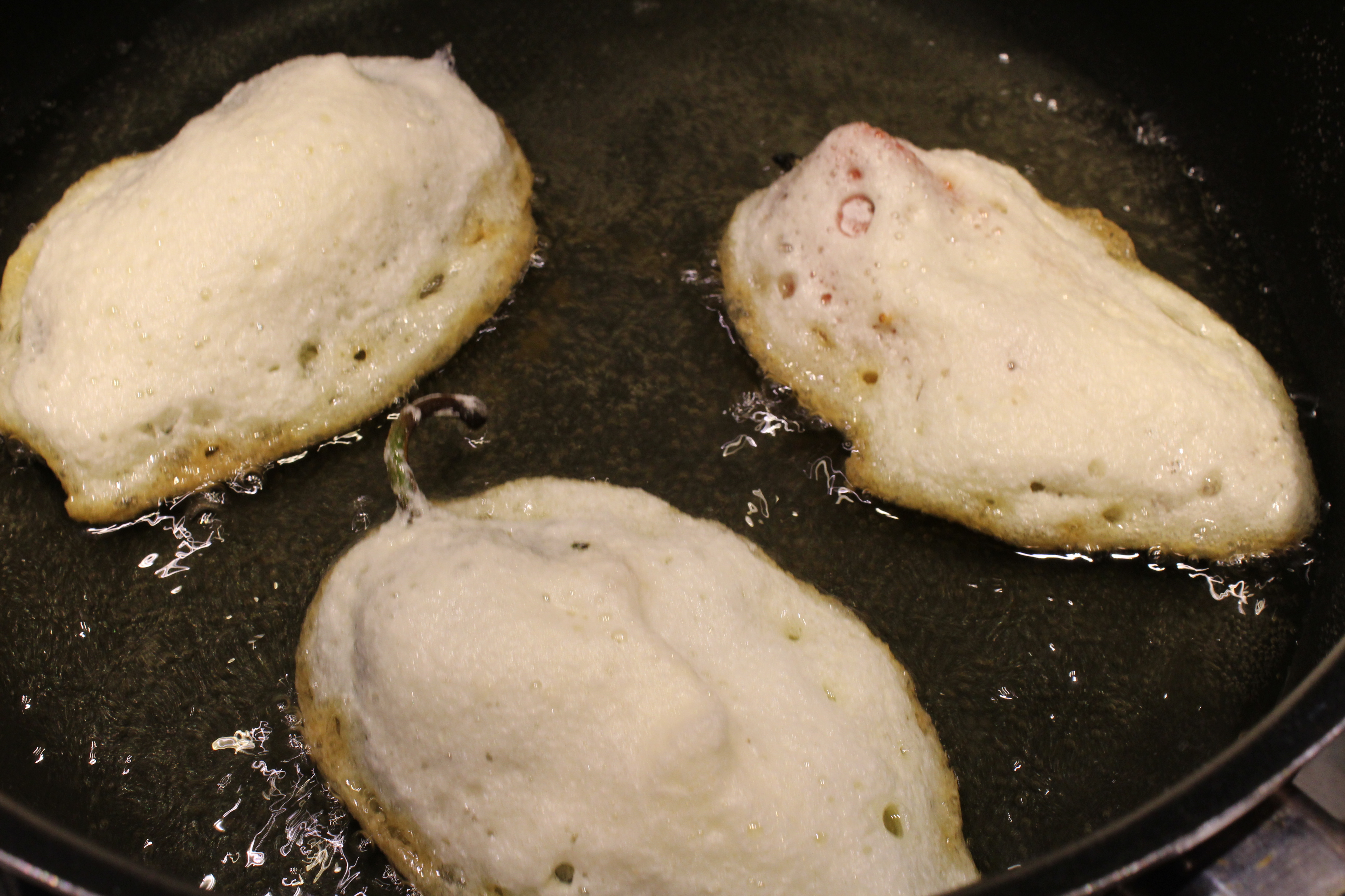 Coat each pepper with the egg mixture and then add them to the hot oil, a few at a time.