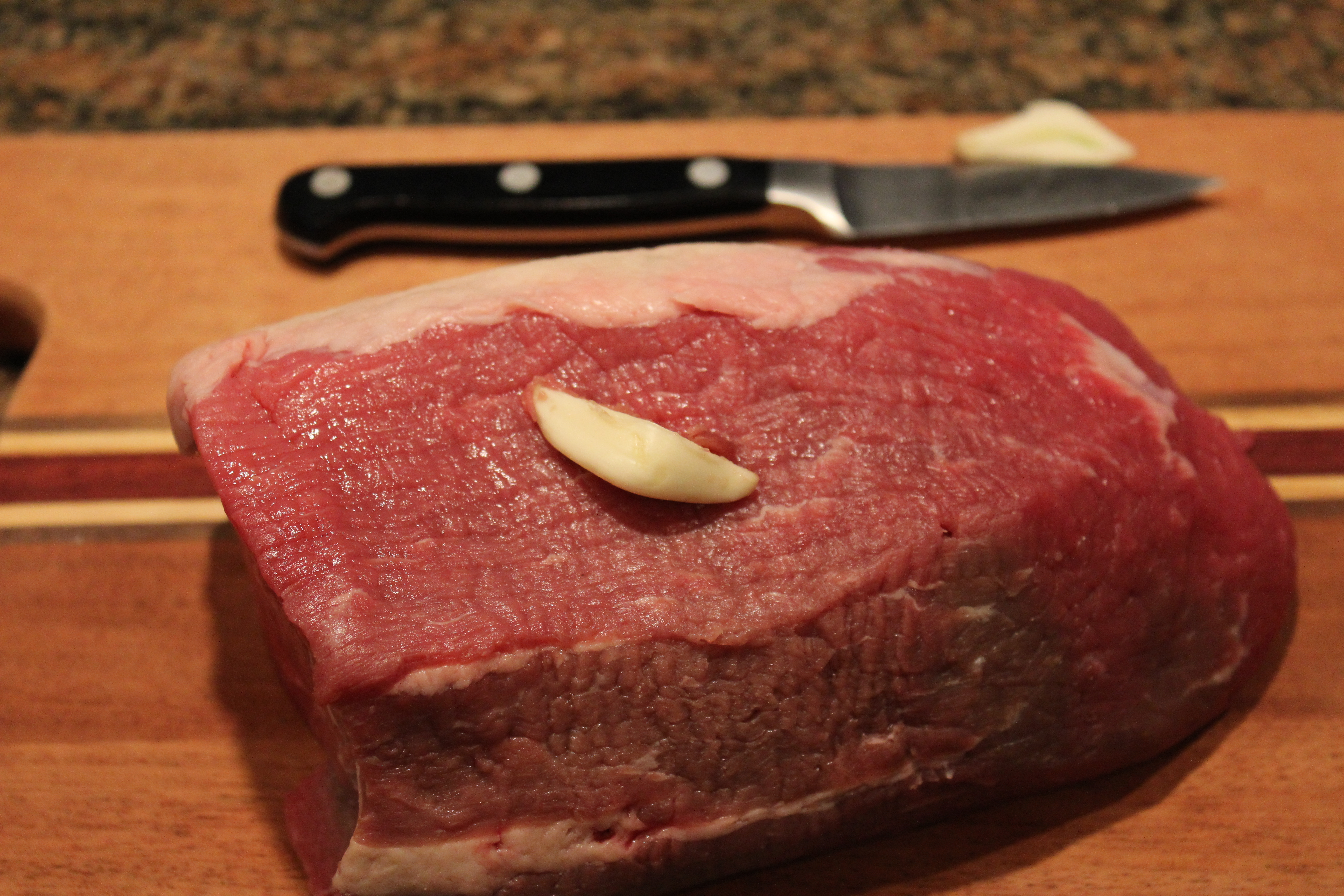 Cut garlic clove in half and rub the cut side of the clove all over the roast. If desired, make a couple of slits in the fat and place the garlic inside of them.