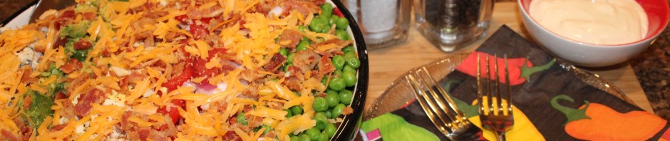 Finally, cover the remaining lettuce with the peas and the bleu cheese crumbles.
