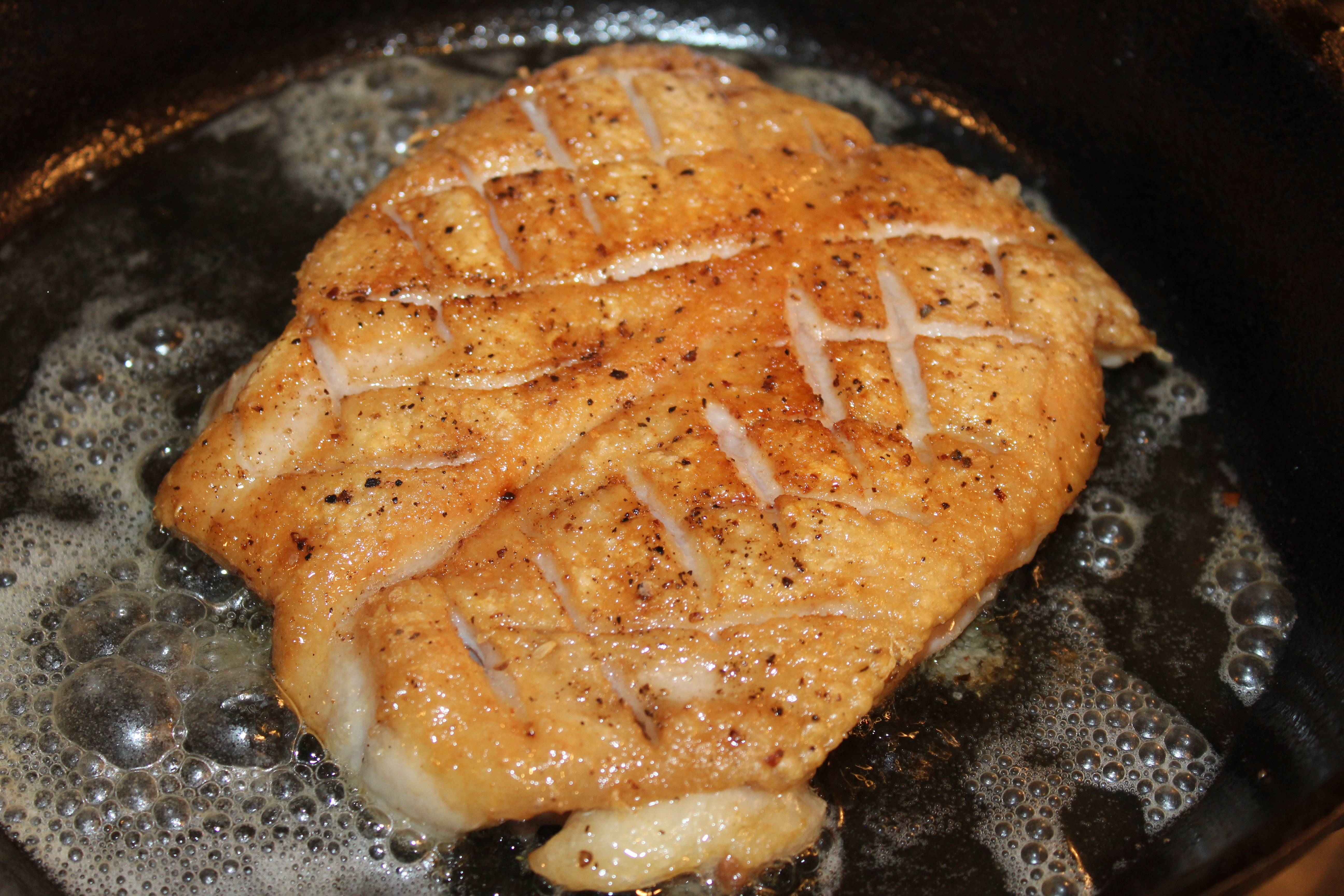 Score the fat side of the chilled breast, being careful not to pierce the meat. Drizzle with a little olive oil and liberally season the breast with salt and pepper on both sides.