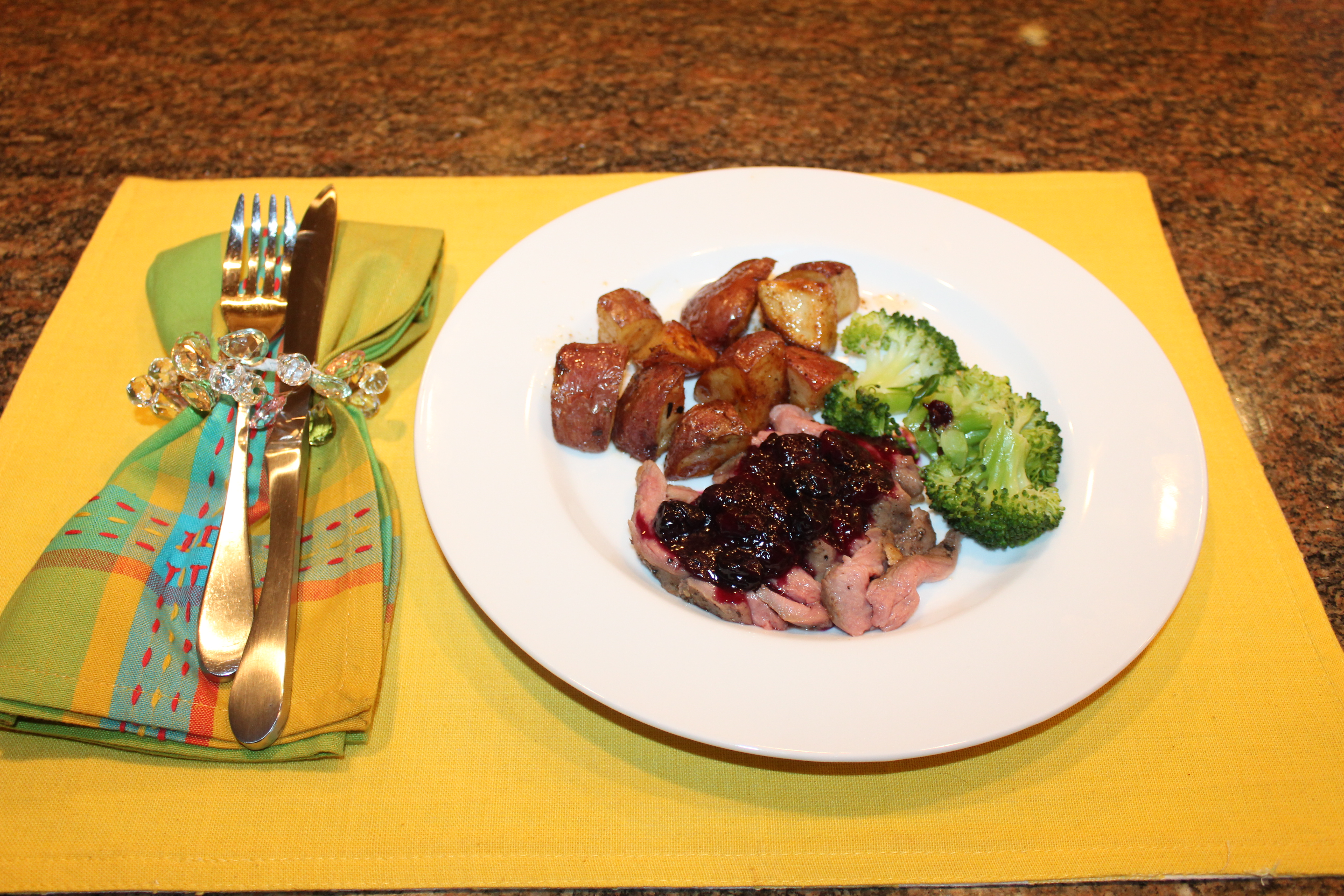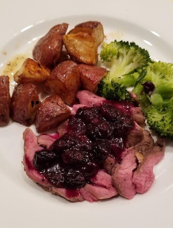 This duck breast pairs well with Kel’s roasted red potatoes and a green veggie of choice. And, of course, a nice glass of wine, such as a pinot noir or merlot,