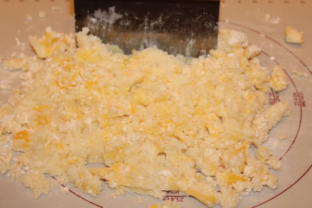 Drizzle the egg yolks on top of the potatoes and sprinkle with ½ cup of sifted flour. Using a bench scraper, chop down repeatedly all over to cut flour and egg yolks into the potato.