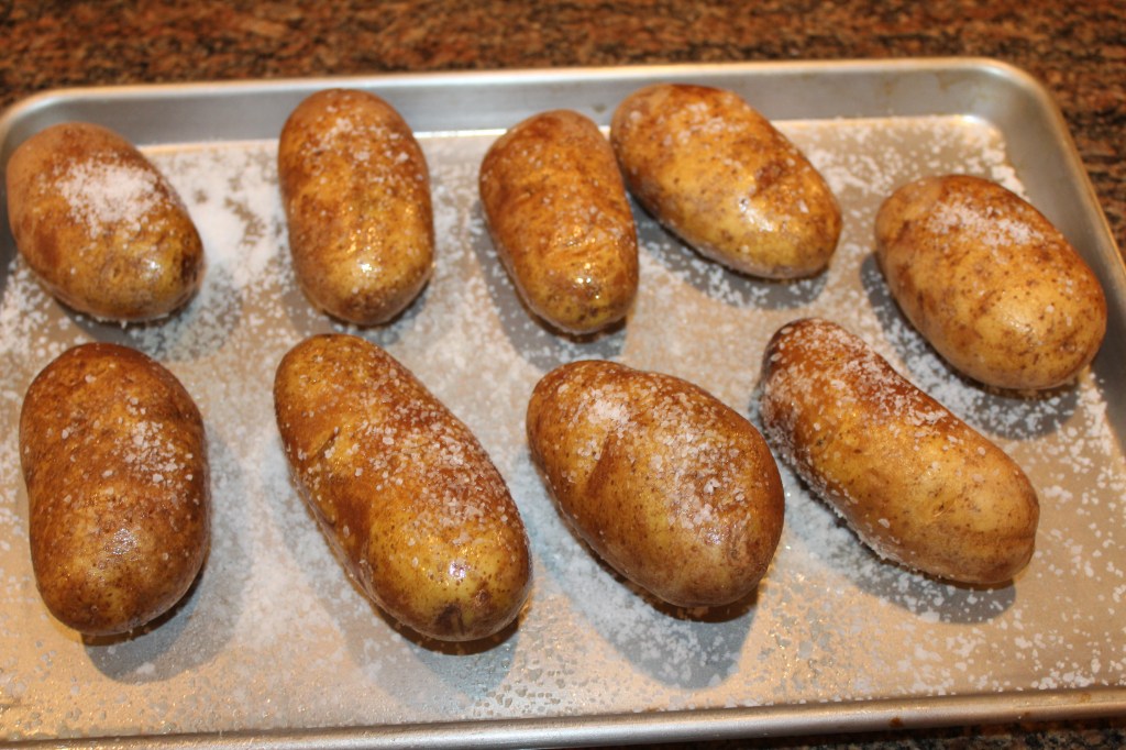 Preheat oven to 425°F. Spray potatoes with cooking spray, place them on a baking sheet and generously coat them with kosher salt. Bake until completely tender throughout when pierced with a fork, about 45 minutes to an hour later.