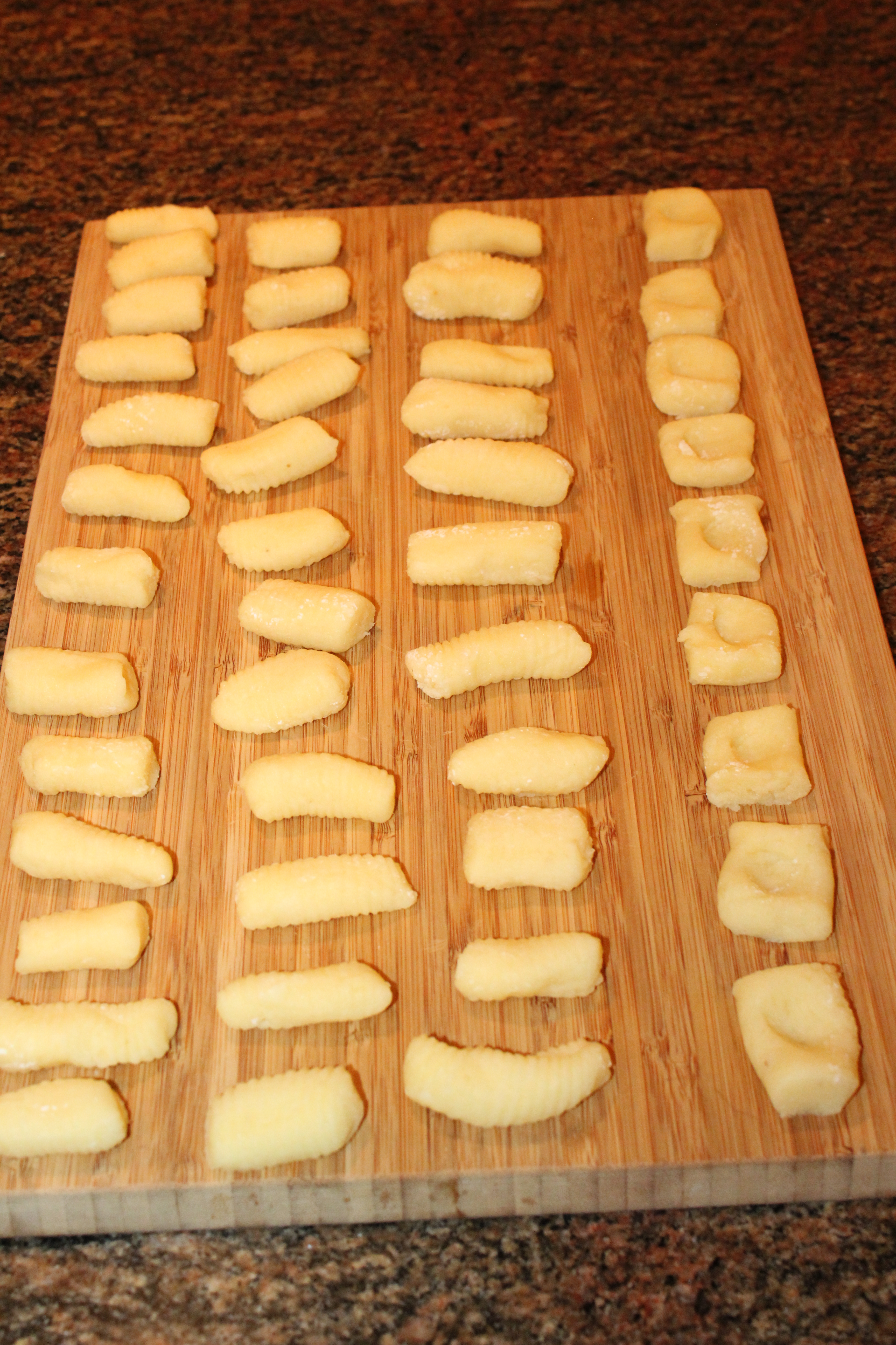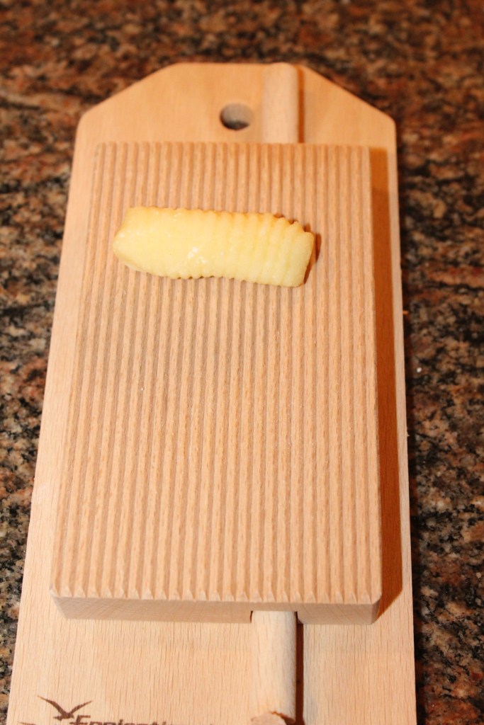 Cut each log into approximately 1-inch portions (obviously I didn’t measure the ones in the photo, lol). Use a gnocchi board to make indentations into each of the gnocchi or, alternatively, just make leave a small thumbprint in each piece of dough, which in my opinion is faster and easier, but just not as fancy. This step allows the sauce to adhere better to the gnocchi.