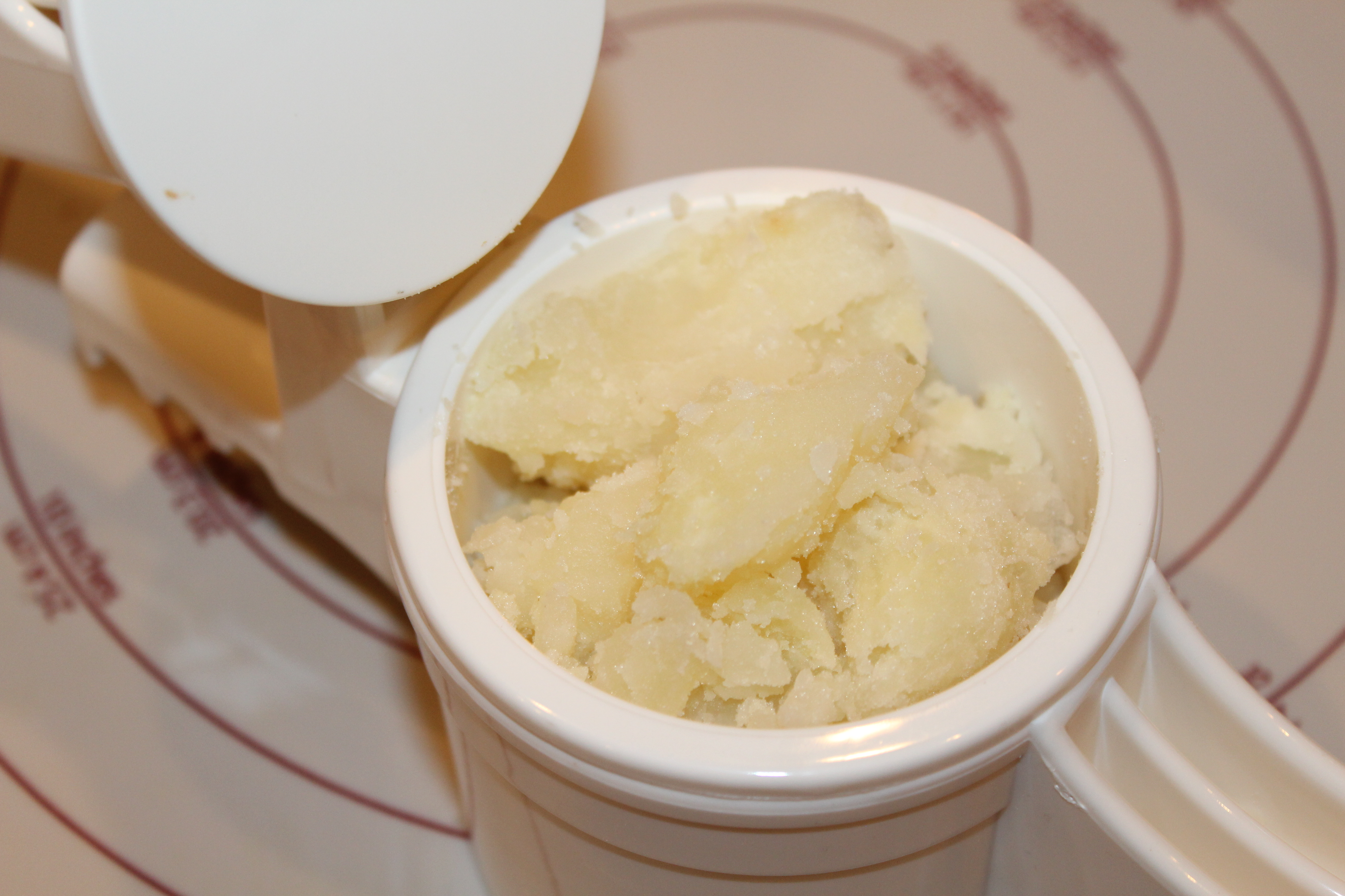 Let potatoes cool a few minutes, slice each in half, and scoop out the flesh into a bowl. Working in batches, use a ricer to press the potatoes onto a clean work surface.