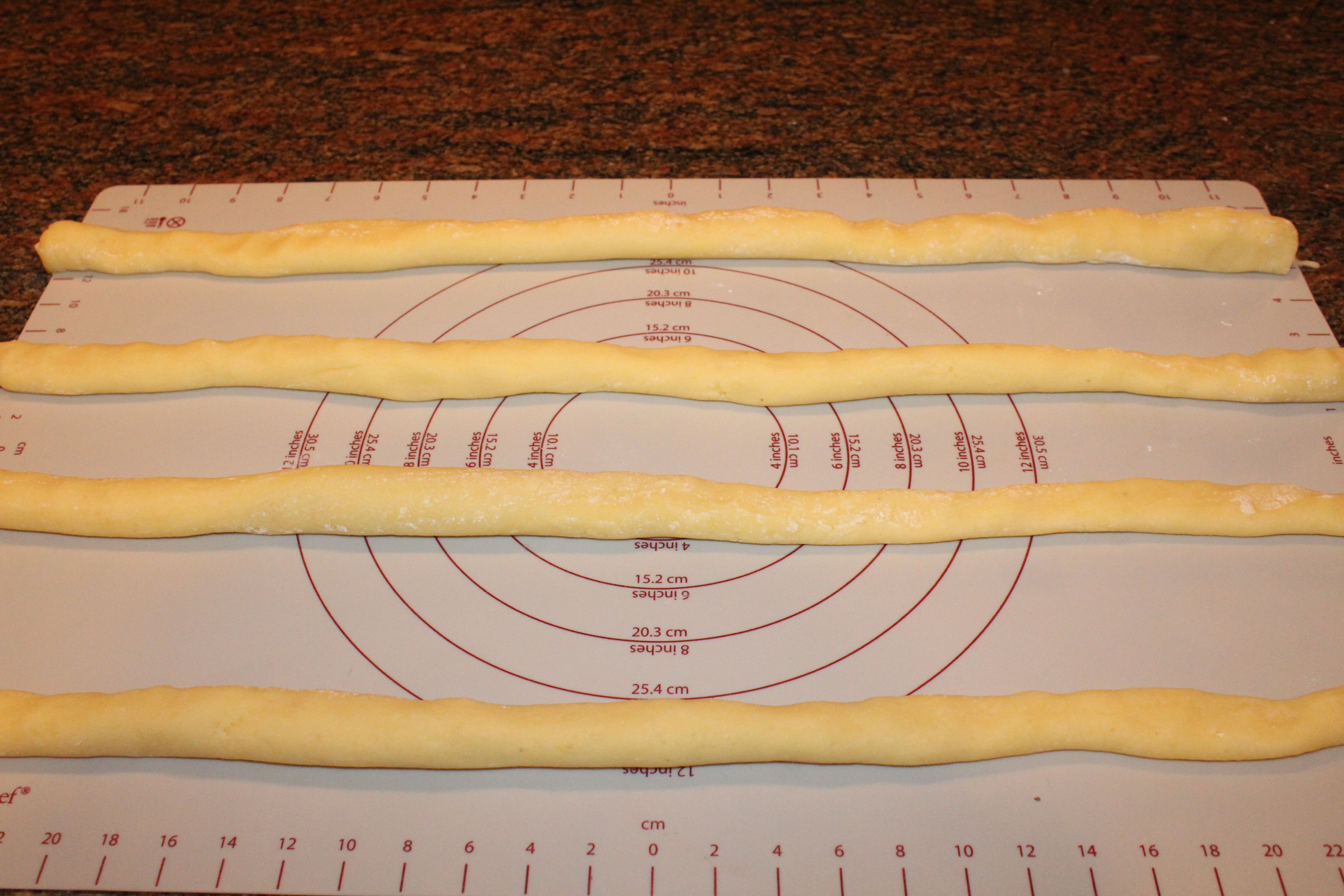 Dust a new work area with flour. Using bench scraper, slice divide the dough into 4 equal sections and roll into logs about ½ inch thick, dusting with flour as needed to prevent sticking.